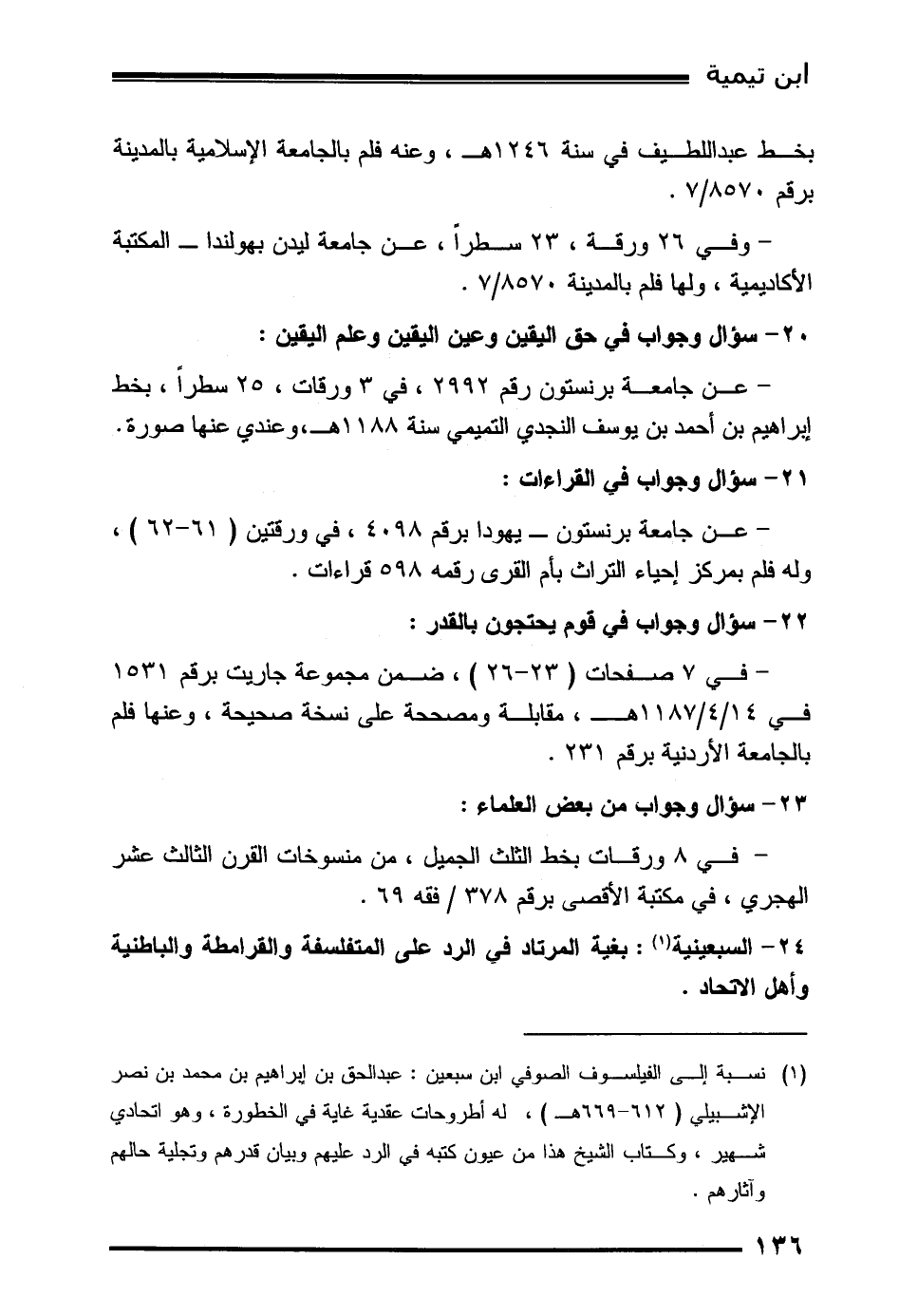 (1) نسبة إلى الفيلسوف الصوفي ابن سبعين: عبد الحق بن إبراهيم بن محمد بن نصر الإشبيلي (612-669هـ) ، له أطروحات عقدية غاية في الخطورة، وهو اتحادي شهير، وكتاب الشيخ هذا من عيون كتبه في الرد عليهم وبيان قدرهم وتجلية حالهم وآثارهم.