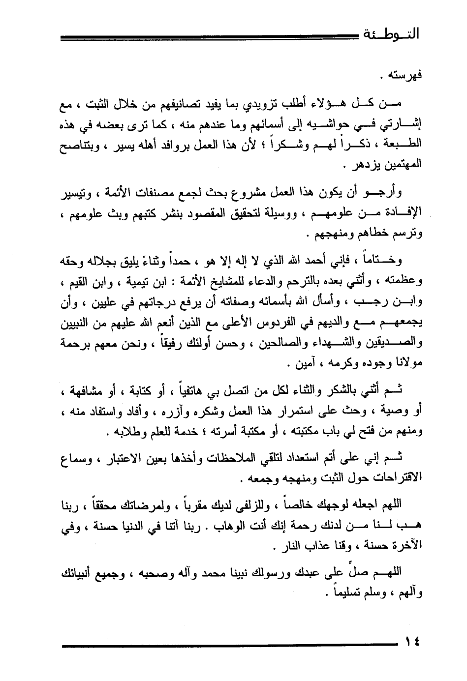 ثم أثني بالشكر والثناء لكل من اتصل بي هاتفياً، أو كتابة، أو مشافهة، أو وصية، وحث على استمرار هذا العمل وشكره وآزره، وأفاد واستفاد منه، ومنهم من فتح لي باب مكتبته، أو مكتبة أسرته؛ خدمة للعلم وطلابه.