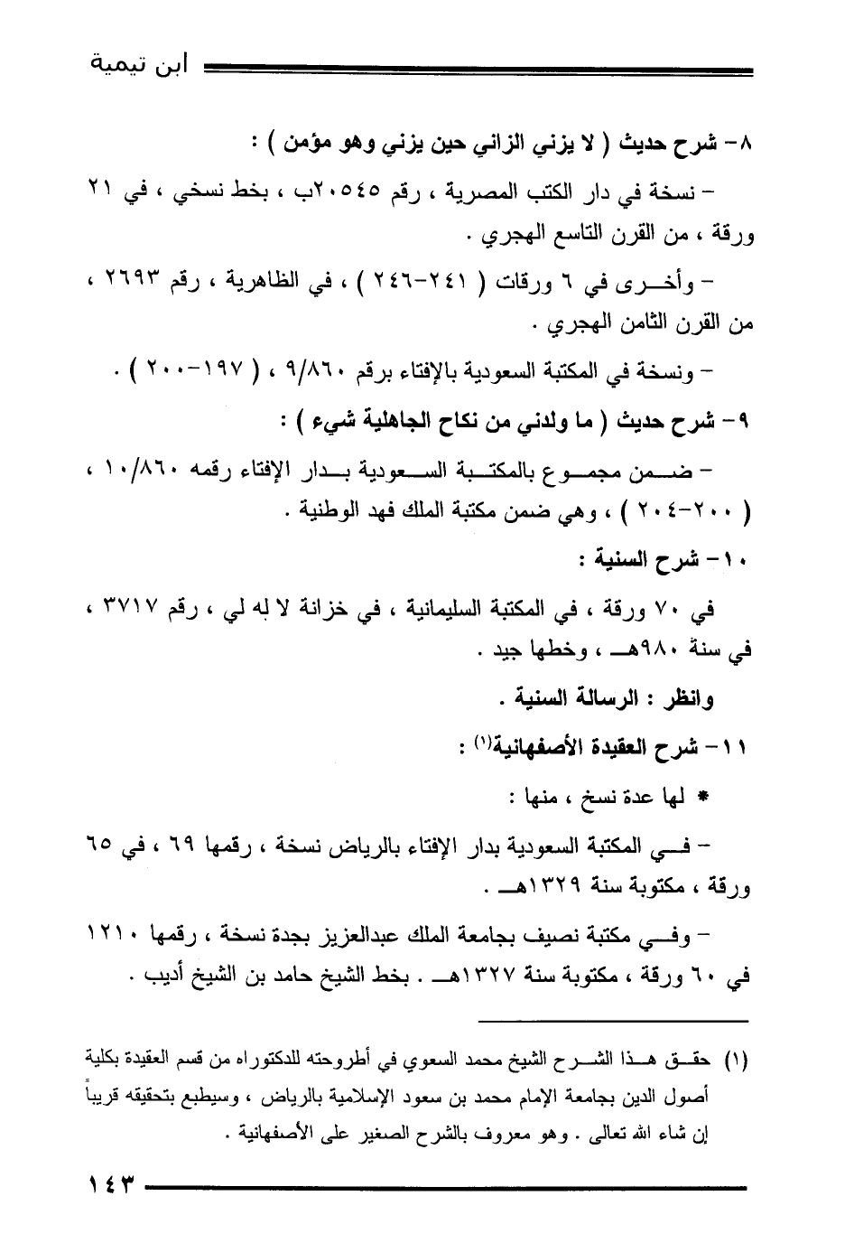 (1) حقق هذا الشرح الشيخ محمد السعوي في أطروحته للدكتوراه من قسم العقيدة بكلية أصول الدين بجامعة الإمام محمد بن سعود الإسلامية بالرياض، وسيطبع بتحقيقه قريباً إن شاء الله تعالى. وهو معروف بالشرح الصغير على الأصفهانية.