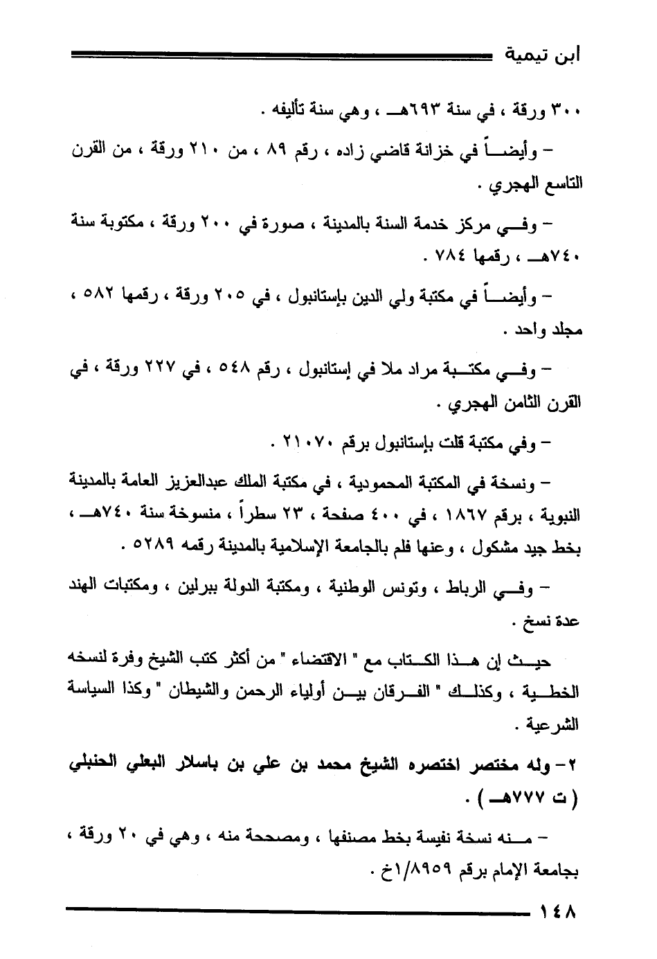 حيث إن هذا الكتاب مع " الاقتضاء " من أكثر كتب الشيخ وفرة لنسخه الخطية، وكذلك " الفرقان بين أولياء الرحمن والشيطان " وكذا السياسة الشرعية.