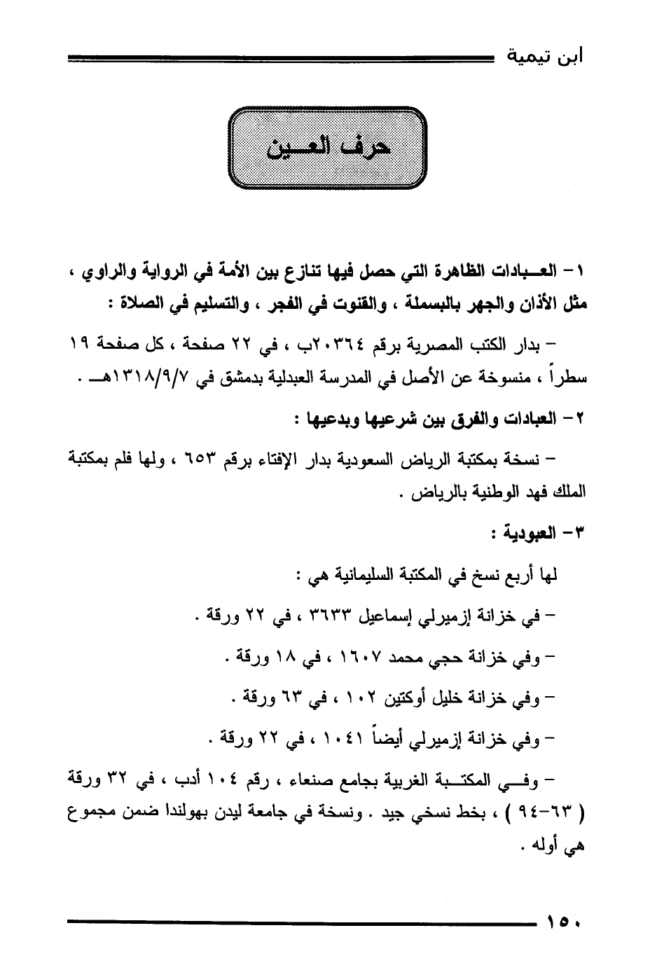1- العبادات الظاهرة التي حصل فيها تنازع بين الأمة في الرواية والراوي، مثل الأذان والجهر بالبسملة، والقنوت في الفجر، والتسليم في الصلاة: