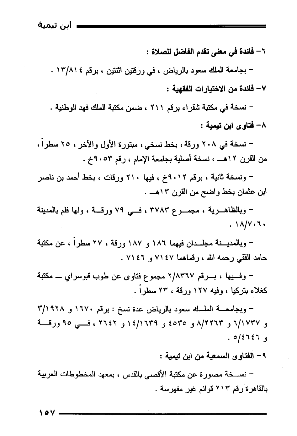 - وبجامعة الملك سعود بالرياض عدة نسخ: برقم 1670 و 1928/3 و 1737/6 و 2263/8 و 4535 و 1639/14 و 2642، في 95 ورقة و 4646/5.