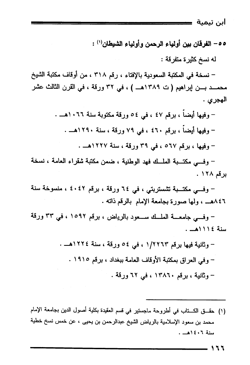 (1) حقق الكتاب في أطروحة ماجستير في قسم العقيدة بكلية أصول الدين بجامعة الإمام محمد بن سعود الإسلامية بالرياض الشيخ عبد الرحمن بن يحيى، عن خمس نسخ خطية سنة 1406هـ.