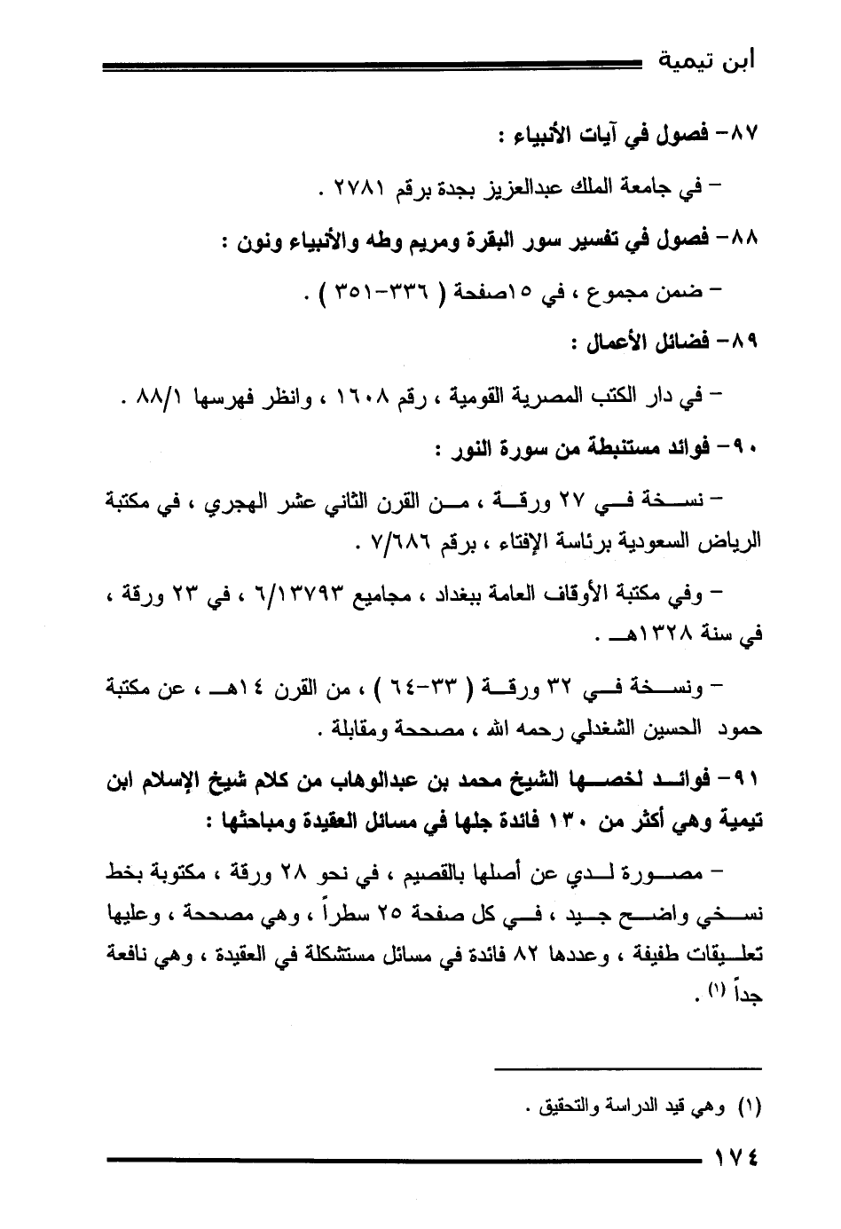 91- فوائد لخصها الشيخ محمد بن عبد الوهاب من كلام شيخ الإسلام ابن تيمية وهي أكثر من 130 فائدة جلها في مسائل العقيدة ومباحثها: