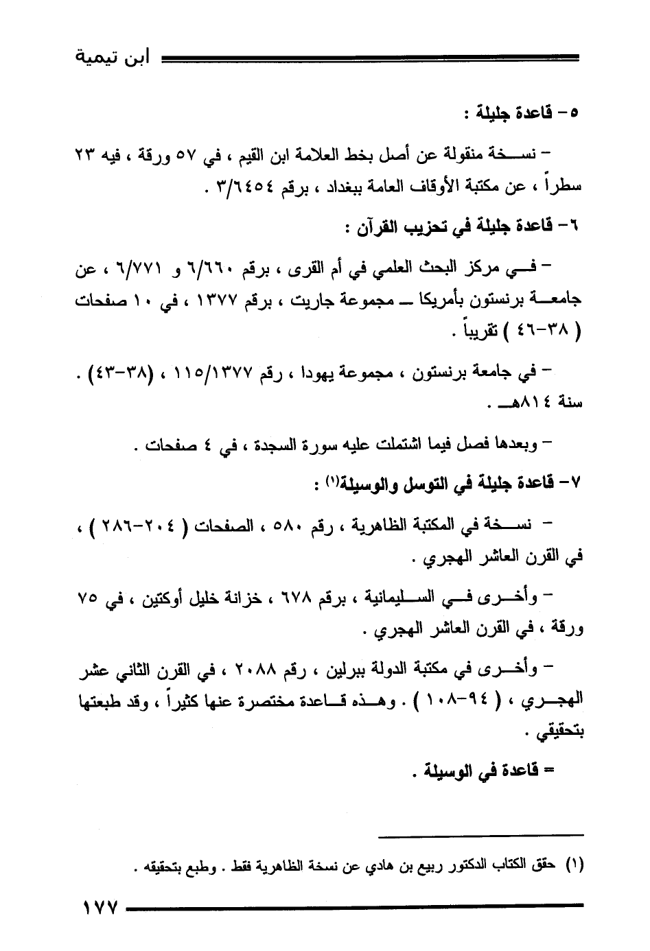 - وأخرى في مكتبة الدولة ببرلين، رقم 2088، في القرن الثاني عشر الهجري، (94-108) . وهذه قاعدة مختصرة عنها كثيراً، وقد طبعتها بتحقيقي.
