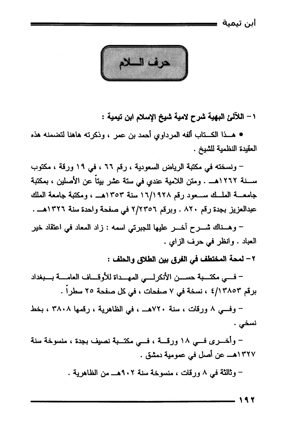 - وأخرى في 18 ورقة، في مكتبة نصيف بجدة، منسوخة سنة 1327هـ عن أصل في عمومية دمشق.