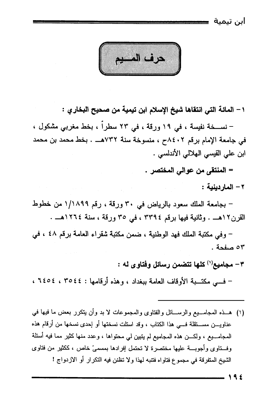 (1) هذه المجاميع والرسائل والفتاوى والمجموعات لا بد وأن يتكرر بعض ما فيها في عناوين مستقلة في هذا الكتاب، وقد استلت نسختها أو إحدى نسخها من أرقام هذه المجاميع، ولكن هذه المجاميع لم يتبين لي محتواها، وعدد منها كثير مما فيه أسئلة وفتاوى وأجوبة عليها مختصرة لا تحتمل إفرادها بمسمىً خاص، ككثير من فتاوى الشيخ المتفرقة في مجموع فتاواه فتنبه لهذا ولا تظنن فيه التكرار أو الازدواج!