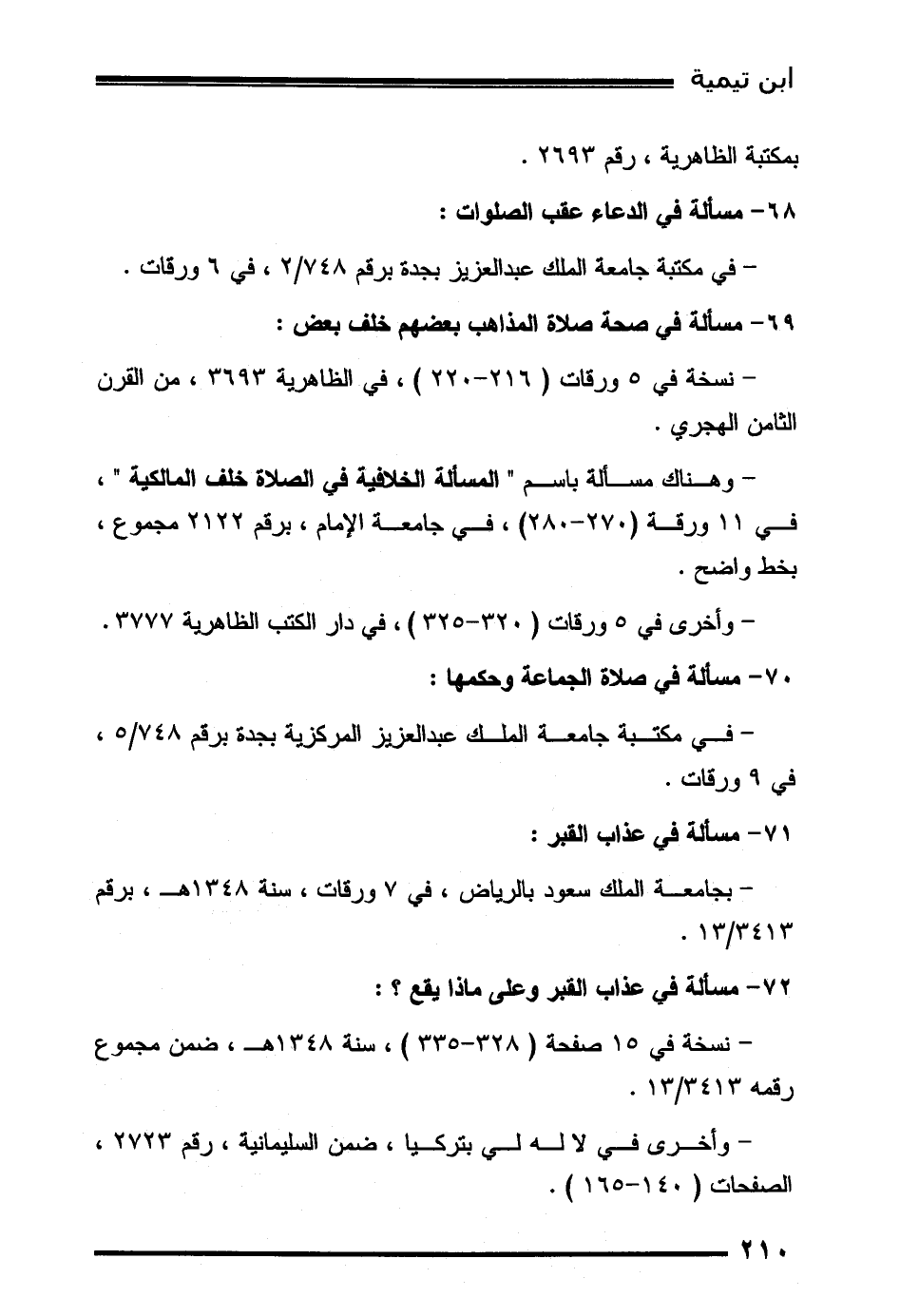 - وهناك مسألة باسم " المسألة الخلافية في الصلاة خلف المالكية "، في 11 ورقة (270-280) ، في جامعة الإمام، برقم 2122 مجموع، بخط واضح.