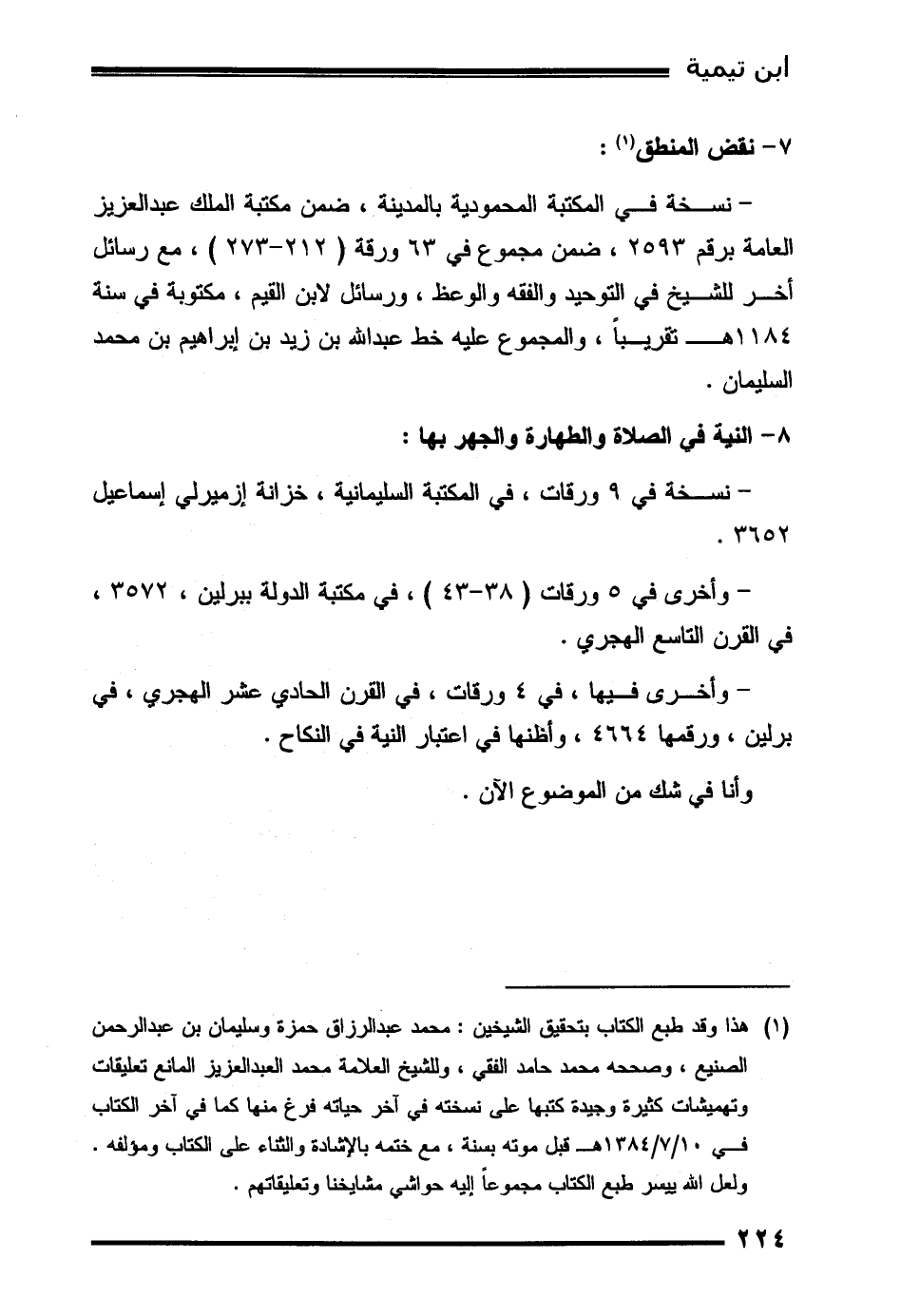 (1) هذا وقد طبع الكتاب بتحقيق الشيخين: محمد عبد الرزاق حمزة وسليمان بن عبد الرحمن الصنيع، وصححه محمد حامد الفقي، وللشيخ العلامة محمد العبد العزيز المانع تعليقات وتهميشات كثيرة وجيدة كتبها على نسخته في آخر حياته فرغ منها كما في آخر الكتاب في 10/7/1384هـ قبل موته بسنة، مع ختمه بالإشادة والثناء على الكتاب ومؤلفه. ولعل الله ييسر طبع الكتاب مجموعاً إليه حواشي مشايخنا وتعليقاتهم.