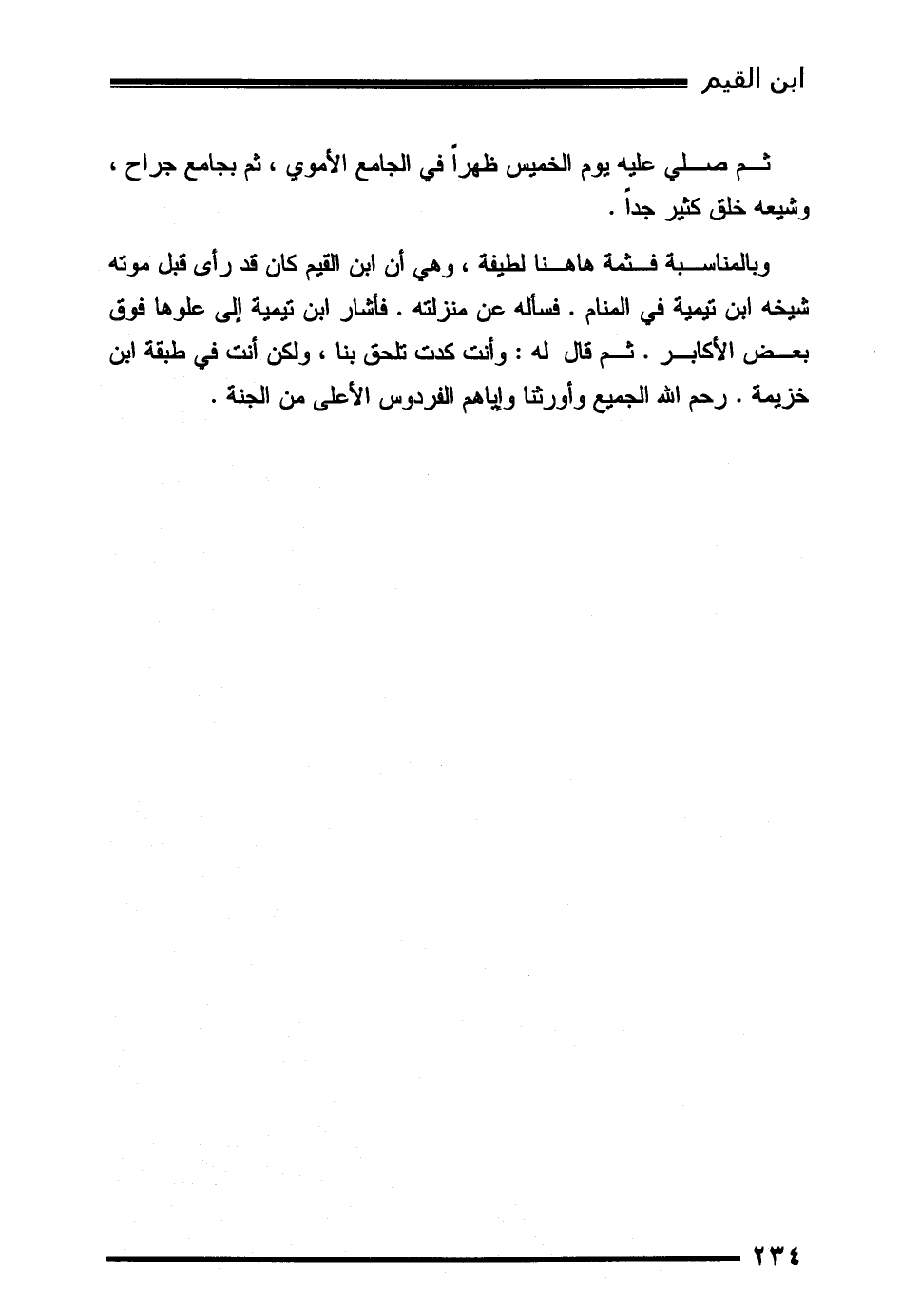 وبالمناسبة فثمة هاهنا لطيفة، وهي أن ابن القيم كان قد رأى قبل موته شيخه ابن تيمية في المنام. فسأله عن منزلته. فأشار ابن تيمية إلى علوها فوق بعض الأكابر. ثم قال له: وأنت كدت تلحق بنا، ولكن أنت في طبقة ابن خزيمة. رحم الله الجميع وأورثنا وإياهم الفردوس الأعلى من الجنة.