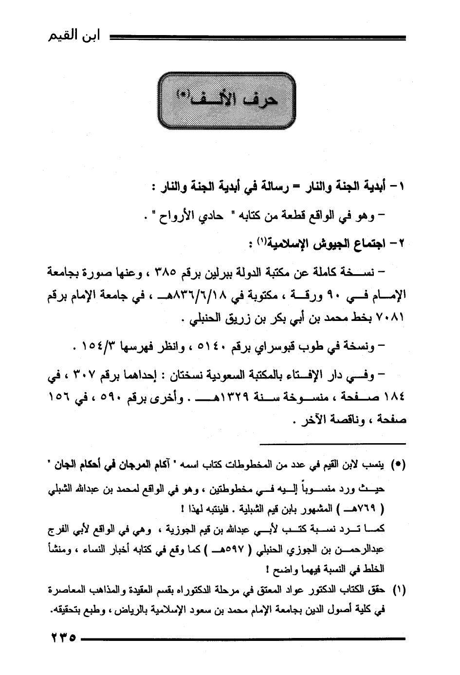 (*) ينسب لابن القيم في عدد من المخطوطات كتاب اسمه " آكام المرجان في أحكام الجان " حيث ورد منسوباً إليه في مخطوطتين، وهو في الواقع لمحمد بن عبد الله الشبلي (769هـ) المشهور بابن قيم الشبلية. فلينتبه لهذا!