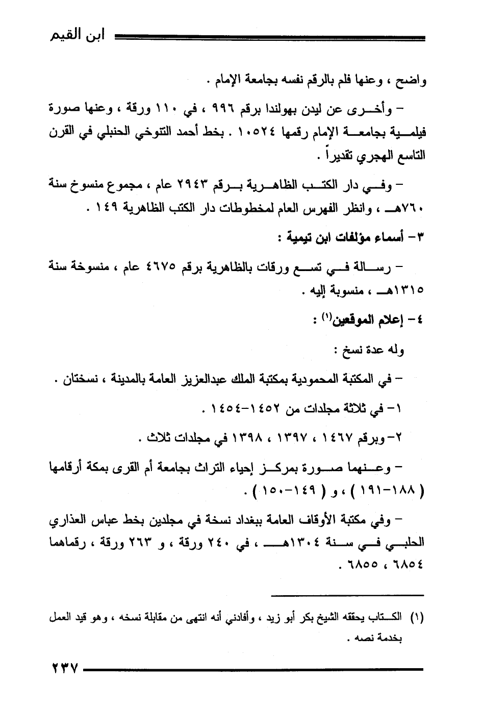 (1) الكتاب يحققه الشيخ بكر أبو زيد، وأفادني أنه انتهى من مقابلة نسخه، وهو قيد العمل بخدمة نصه.