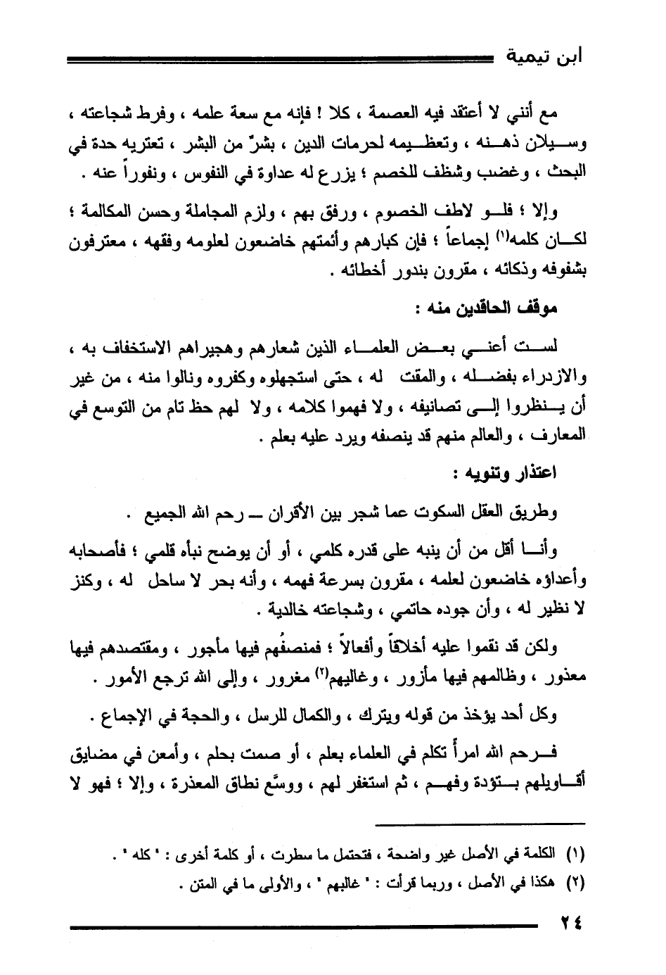 مع أنني لا أعتقد فيه العصمة، كلا! فإنه مع سعة علمه، وفرط شجاعته، وسيلان ذهنه، وتعظيمه لحرمات الدين، بشرٌ من البشر، تعتريه حدة في البحث، وغضب وشظف للخصم؛ يزرع له عداوة في النفوس، ونفوراً عنه.