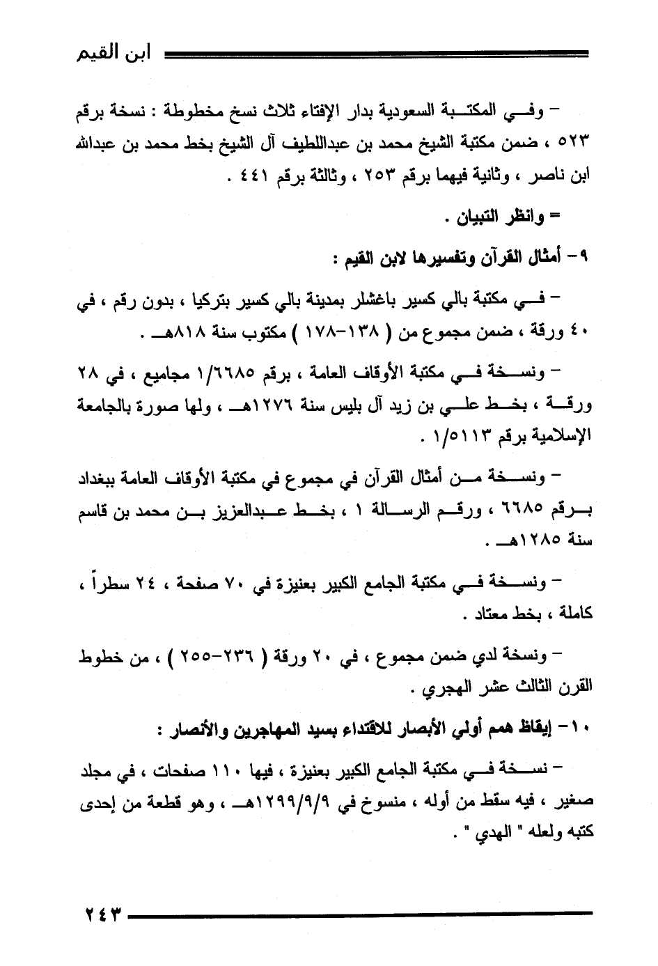 - نسخة في مكتبة الجامع الكبير بعنيزة، فيها 110 صفحات، في مجلد صغير، فيه سقط من أوله، منسوخ في 9/9/1299هـ، وهو قطعة من إحدى كتبه ولعله " الهدي ".