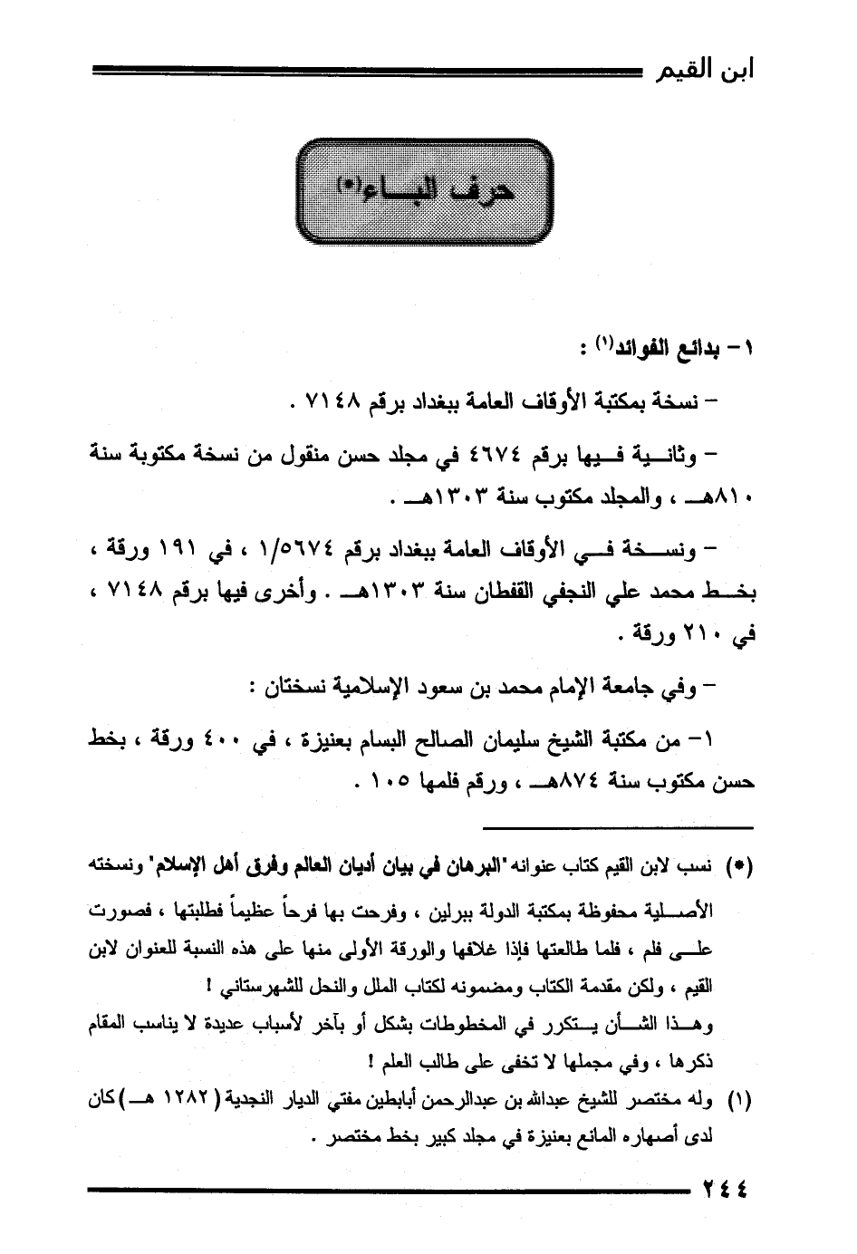 (*) نسب لابن القيم كتاب عنوانه " البرهان في بيان أديان العالم وفرق أهل الإسلام " ونسخته الأصلية محفوظة بمكتبة الدولة ببرلين، وفرحت بها فرحاً عظيماً فطلبتها، فصورت على فلم، فلما طالعتها فإذا غلافها والورقة الأولى منها على هذه النسبة للعنوان لابن القيم، ولكن مقدمة الكتاب ومضمونه لكتاب الملل والنحل للشهرستاني!