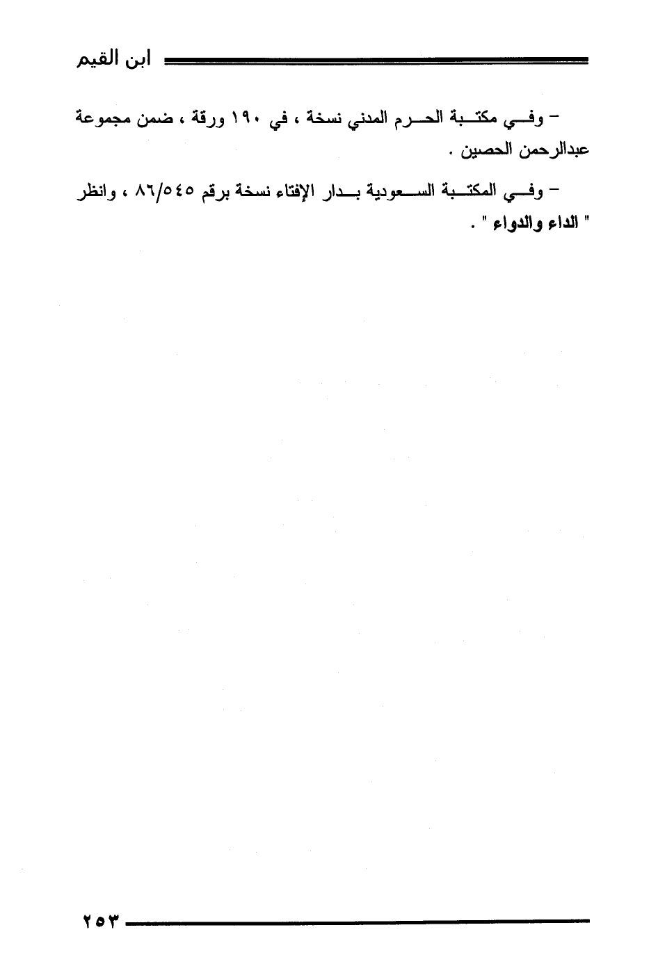 - وفي المكتبة السعودية بدار الإفتاء نسخة برقم 545/86، وانظر " الداء والدواء ".