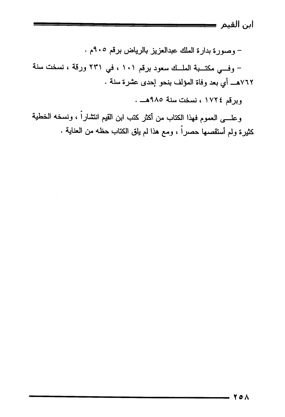 - وفي مكتبة الملك سعود برقم 101، في 231 ورقة، نسخت سنة 762هـ أي بعد وفاة المؤلف بنحو إحدى عشرة سنة.
