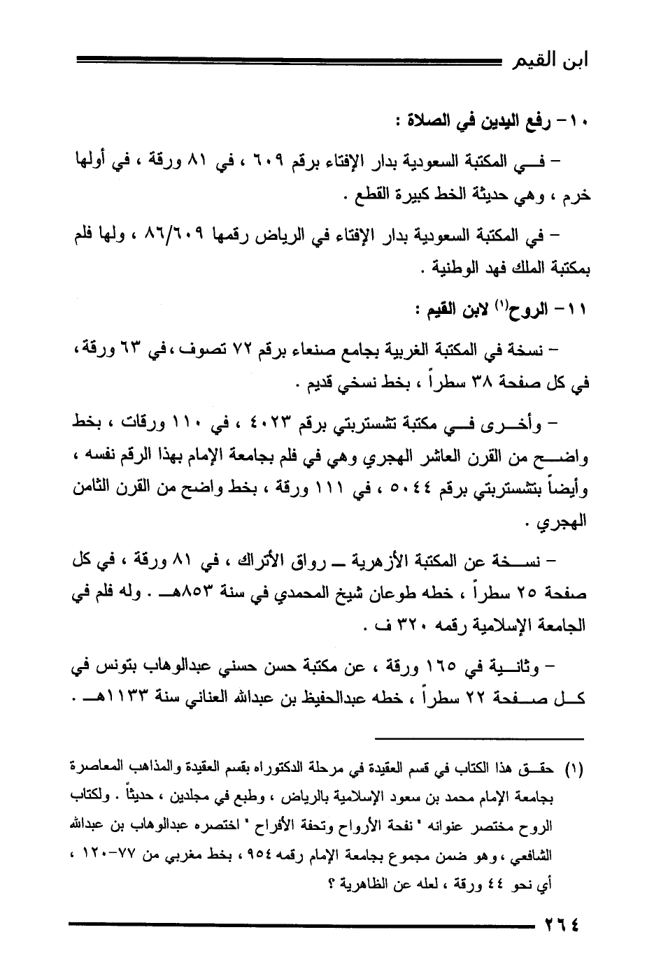 (1) حقق هذا الكتاب في قسم العقيدة في مرحلة الدكتوراه بقسم العقيدة والمذاهب المعاصرة بجامعة الإمام محمد بن سعود الإسلامية بالرياض، وطبع في مجلدين، حديثاً. ولكتاب الروح مختصر عنوانه " نفحة الأرواح وتحفة الأفراح " اختصره عبد الوهاب بن عبد الله الشافعي، وهو ضمن مجموع بجامعة الإمام رقمه 954، بخط مغربي من 77-120، أي نحو 44 ورقة، لعله عن الظاهرية؟