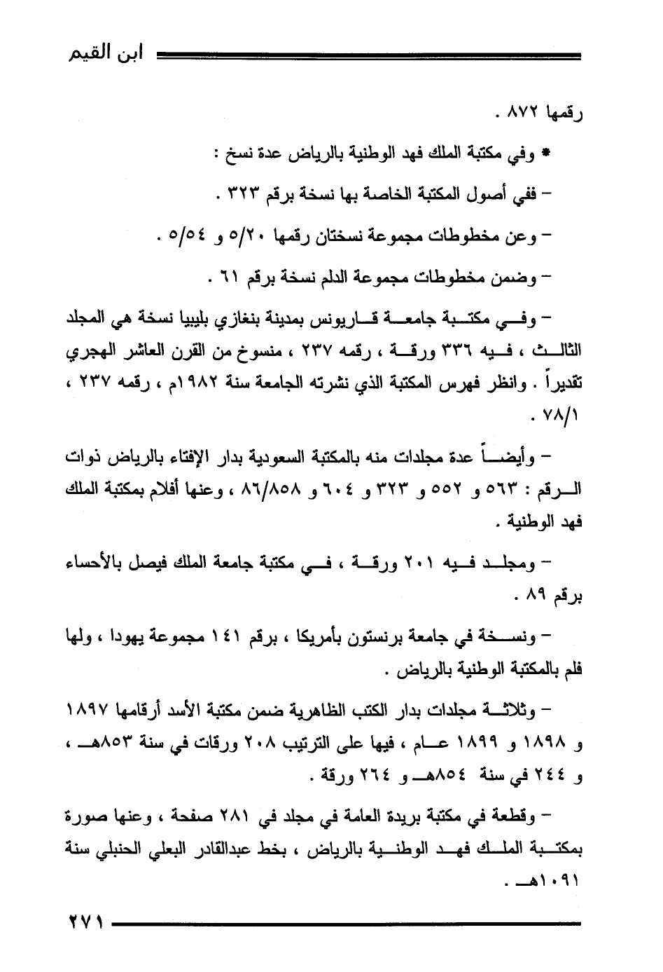 - ومجلد فيه 201 ورقة، في مكتبة جامعة الملك فيصل بالأحساء برقم 89.