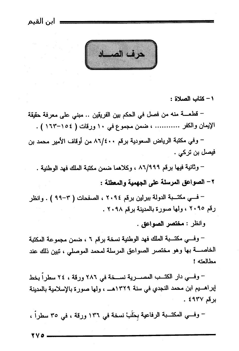 - وفي مكتبة الملك فهد الوطنية نسخة برقم 6، ضمن مجموعة المكتبة الخاصة بها وهو مختصر الصواعق المرسلة لمحمد الموصلي، تبين ذلك عند مطالعته!