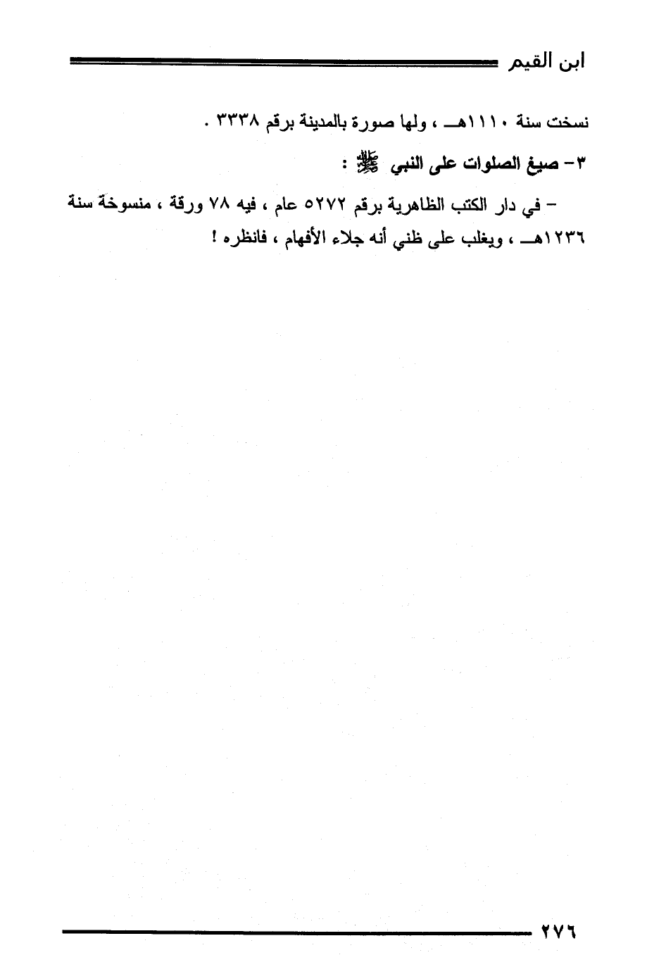- في دار الكتب الظاهرية برقم 5272 عام، فيه 78 ورقة، منسوخة سنة 1236هـ، ويغلب على ظني أنه جلاء الأفهام، فانظره!
