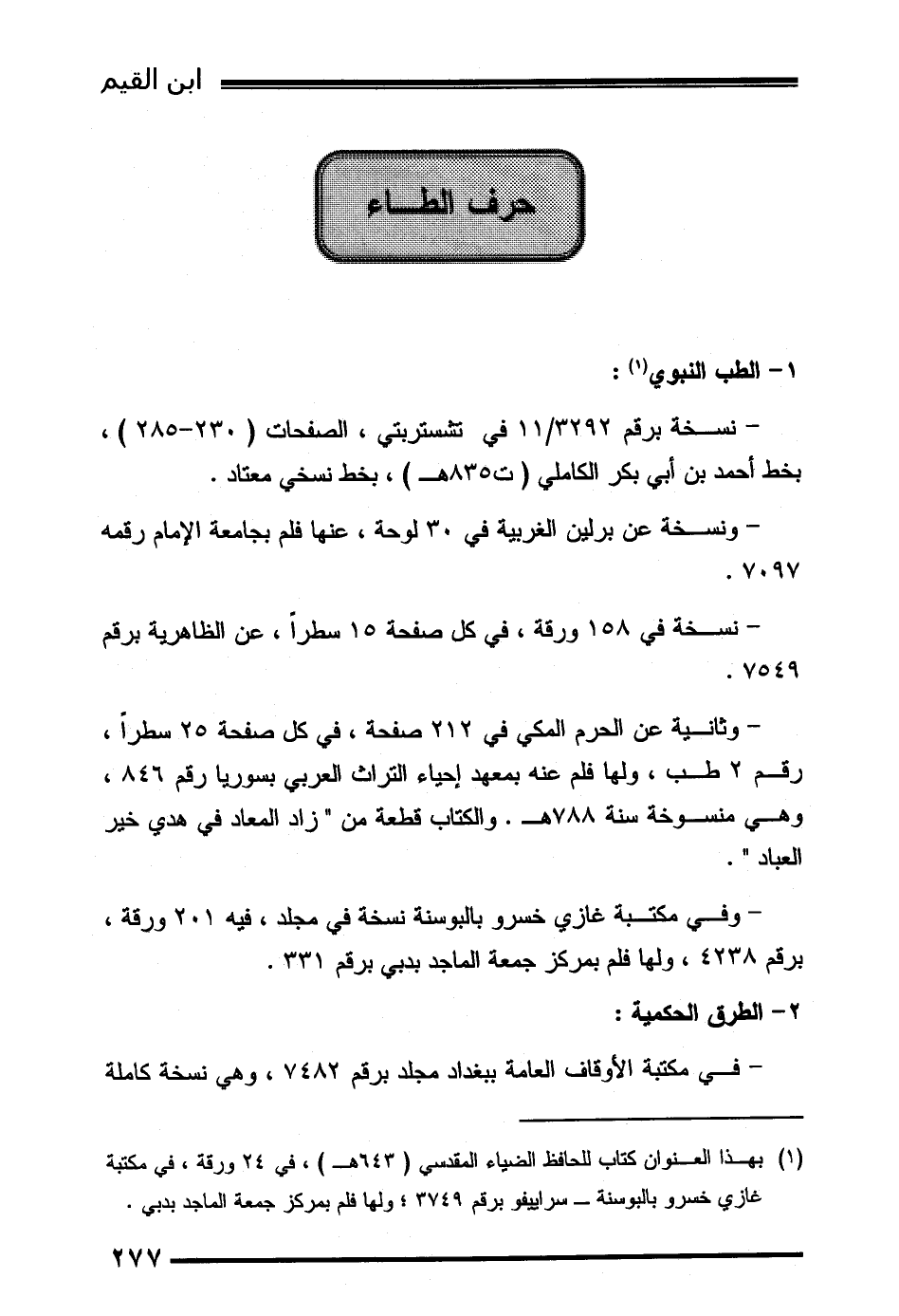 - وثانية عن الحرم المكي في 212 صفحة، في كل صفحة 25 سطراً، رقم 2 طب، ولها فلم عنه بمعهد إحياء التراث العربي بسوريا رقم 846، وهي منسوخة سنة 788هـ. والكتاب قطعة من " زاد المعاد في هدي خير العباد ".
