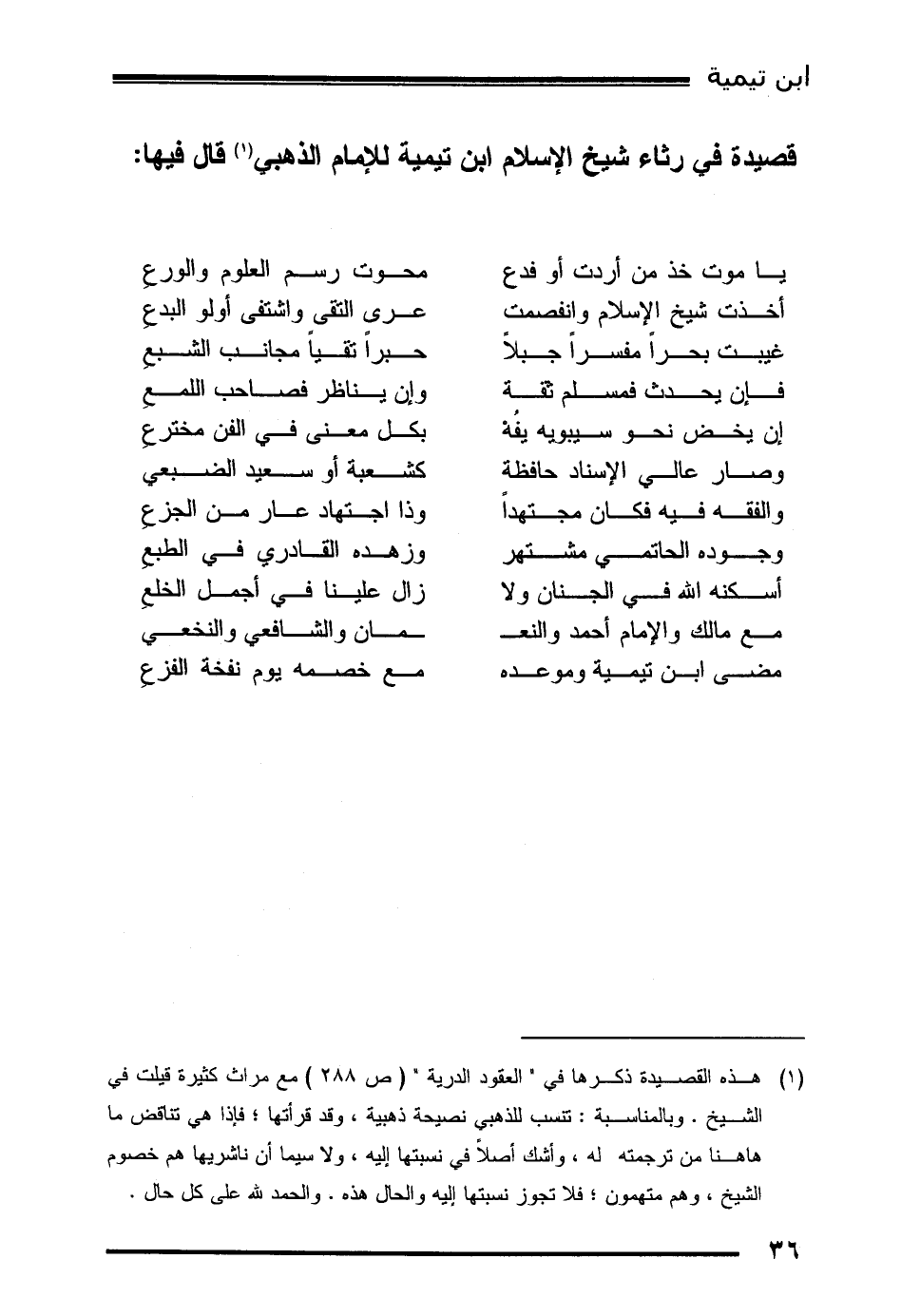 (1) هذه القصيدة ذكرها في " العقود الدرية " (ص 288) مع مراث كثيرة قيلت في الشيخ. وبالمناسبة: تنسب للذهبي نصيحة ذهبية، وقد قرأتها؛ فإذا هي تناقض ما هاهنا من ترجمته له، وأشك أصلاً في نسبتها إليه، ولا سيما أن ناشريها هم خصوم الشيخ، وهم متهمون؛ فلا تجوز نسبتها إليه والحال هذه. والحمد لله على كل حال.