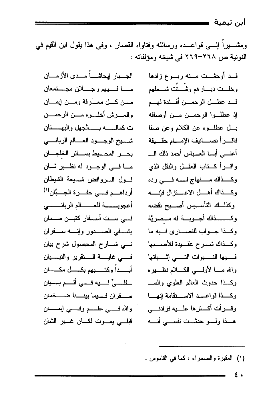 ومشيراً إلى قواعده ورسائله وفتاواه القصار، وفي هذا يقول ابن القيم في النونية ص 268-269 في شيخه ومؤلفاته:
