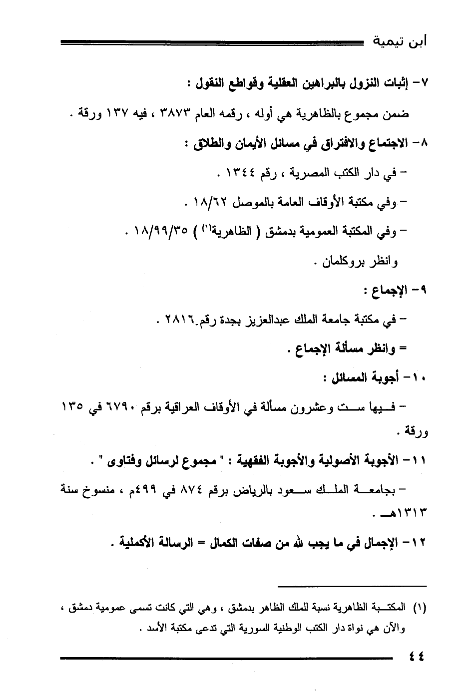 (1) المكتبة الظاهرية نسبة للملك الظاهر بدمشق، وهي التي كانت تسمى عمومية دمشق، والآن هي نواة دار الكتب الوطنية السورية التي تدعى مكتبة الأسد.