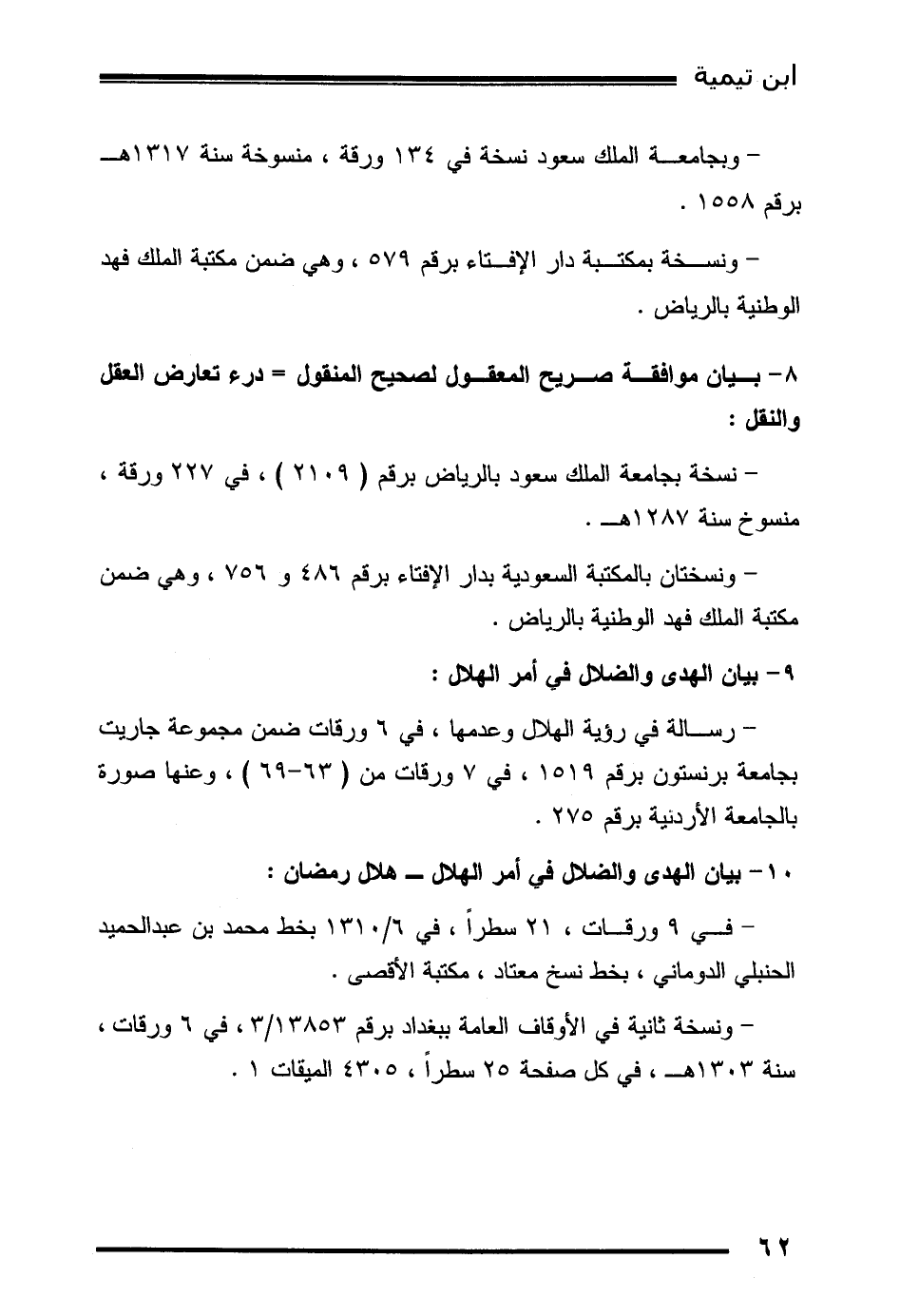 - في 9 ورقات، 21 سطراً، في 6/1310 بخط محمد بن عبد الحميد الحنبلي الدوماني، بخط نسخ معتاد، مكتبة الأقصى.