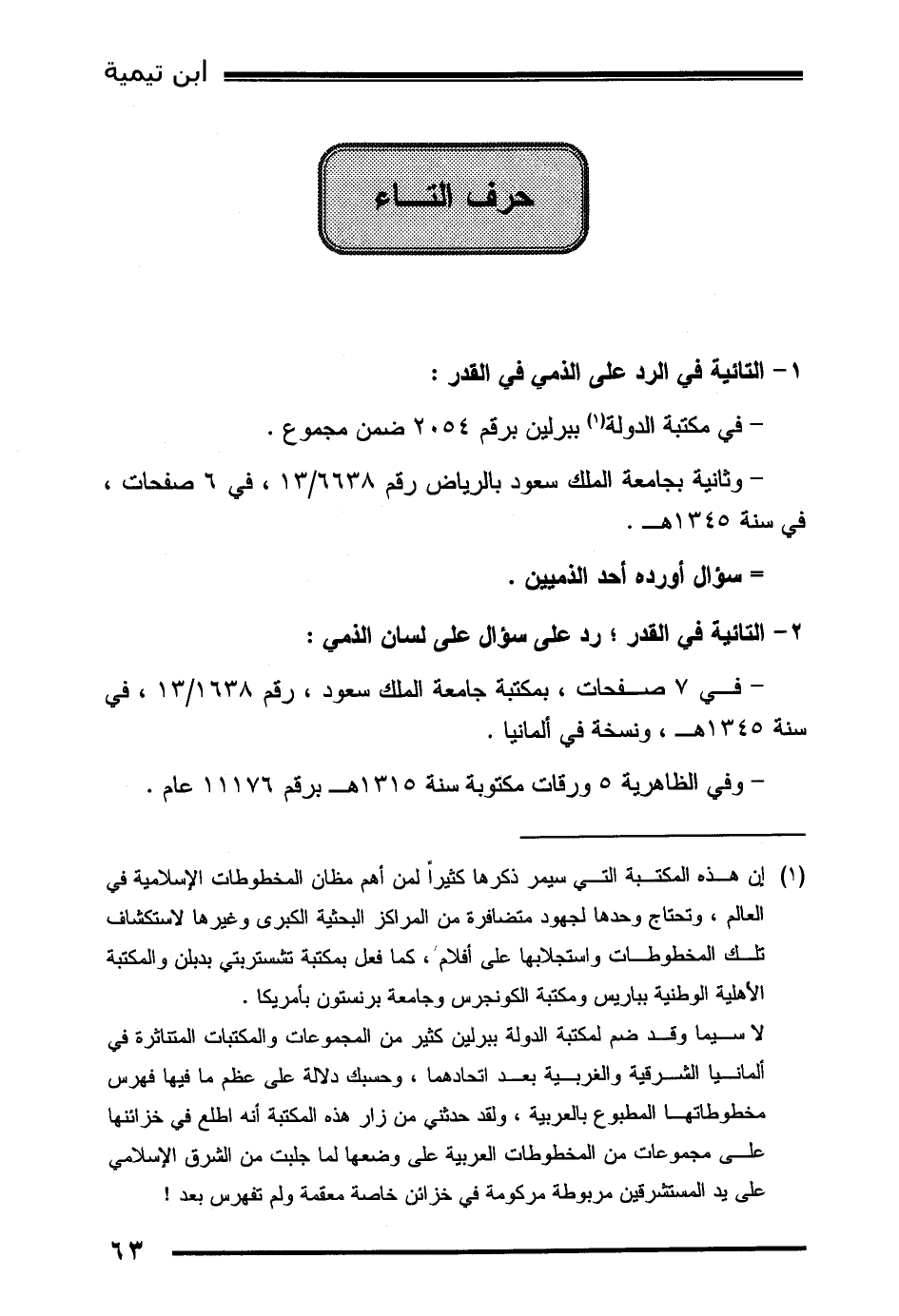 لا سيما وقد ضم لمكتبة الدولة ببرلين كثير من المجموعات والمكتبات المتناثرة في ألمانيا الشرقية والغربية بعد اتحادهما، وحسبك دلالة على عظم ما فيها فهرس مخطوطاتها المطبوع بالعربية، ولقد حدثني من زار هذه المكتبة أنه اطلع في خزائنها على مجموعات من المخطوطات العربية على وضعها لما جلبت من الشرق الإسلامي على يد المستشرقين مربوطة مركومة في خزائن خاصة معقمة ولم تفهرس بعد!