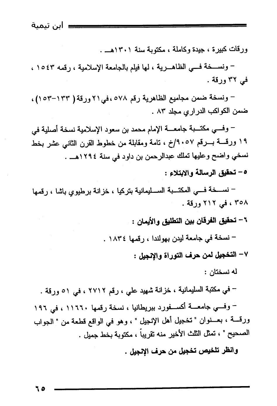 - وفي جامعة أكسفورد ببريطانيا، نسخة رقمها 11660، في 196 ورقة، بعنوان " تخجيل أهل الإنجيل "، وهو في الواقع قطعة من " الجواب الصحيح "، تمثل الثلث الأخير منه تقريباً، مكتوبة بخط جميل.