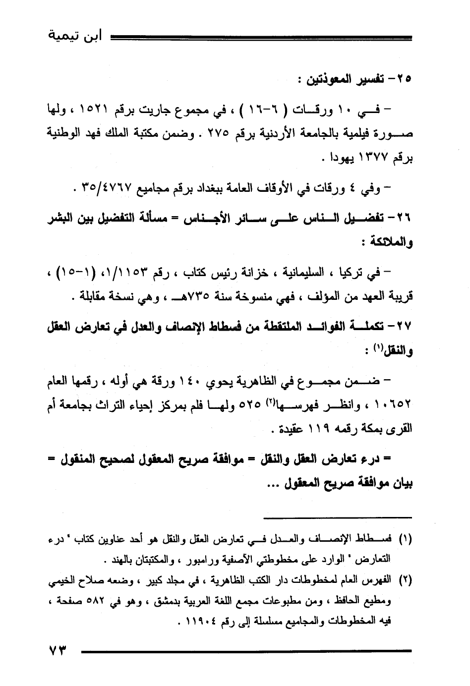 (1) فسطاط الإنصاف والعدل في تعارض العقل والنقل هو أحد عناوين كتاب " درء التعارض " الوارد على مخطوطتي الآصفية ورامبور، والمكتبتان بالهند.