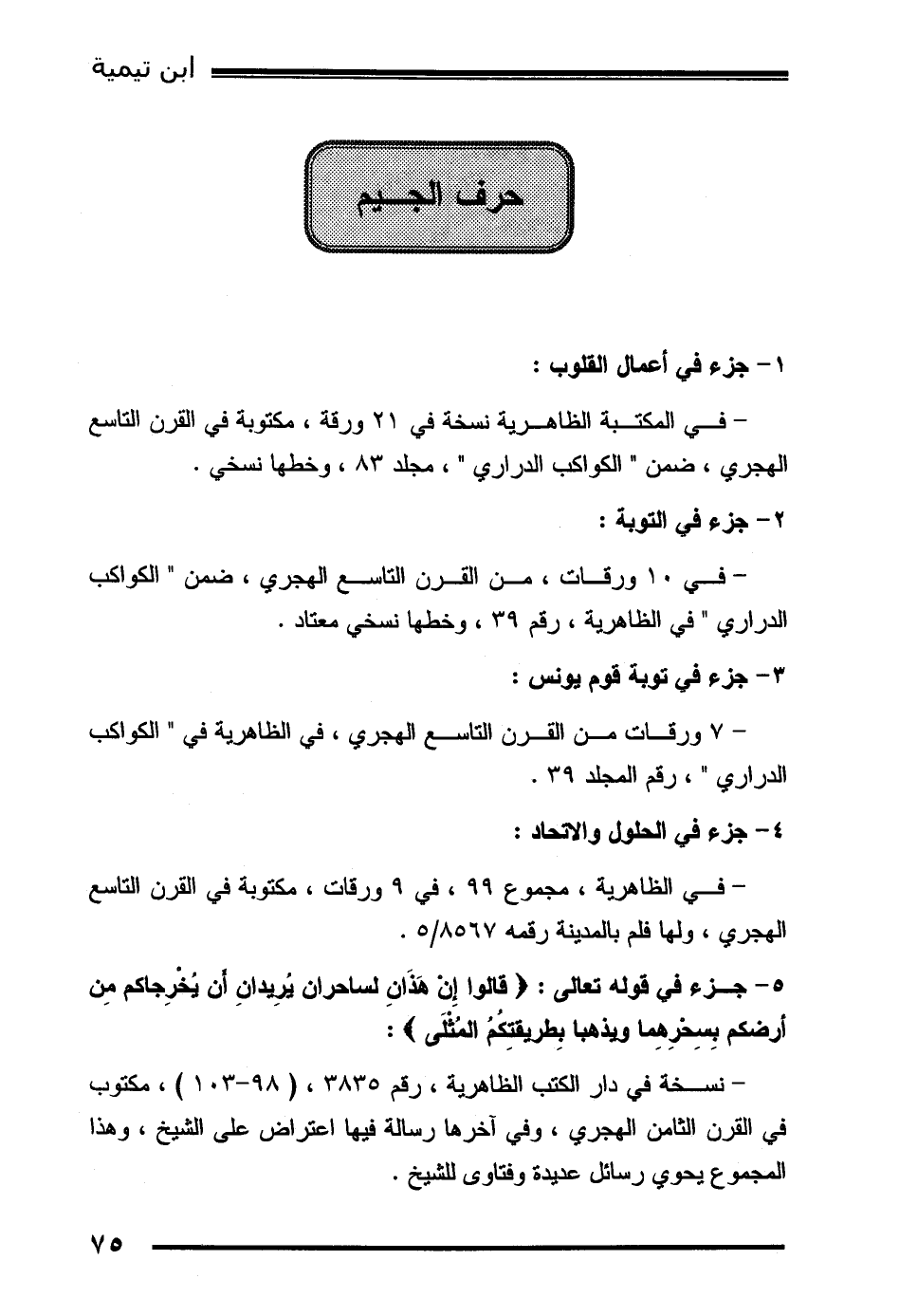 - نسخة في دار الكتب الظاهرية، رقم 3835، (98-103) ، مكتوب في القرن الثامن الهجري، وفي آخرها رسالة فيها اعتراض على الشيخ، وهذا المجموع يحوي رسائل عديدة وفتاوى للشيخ.
