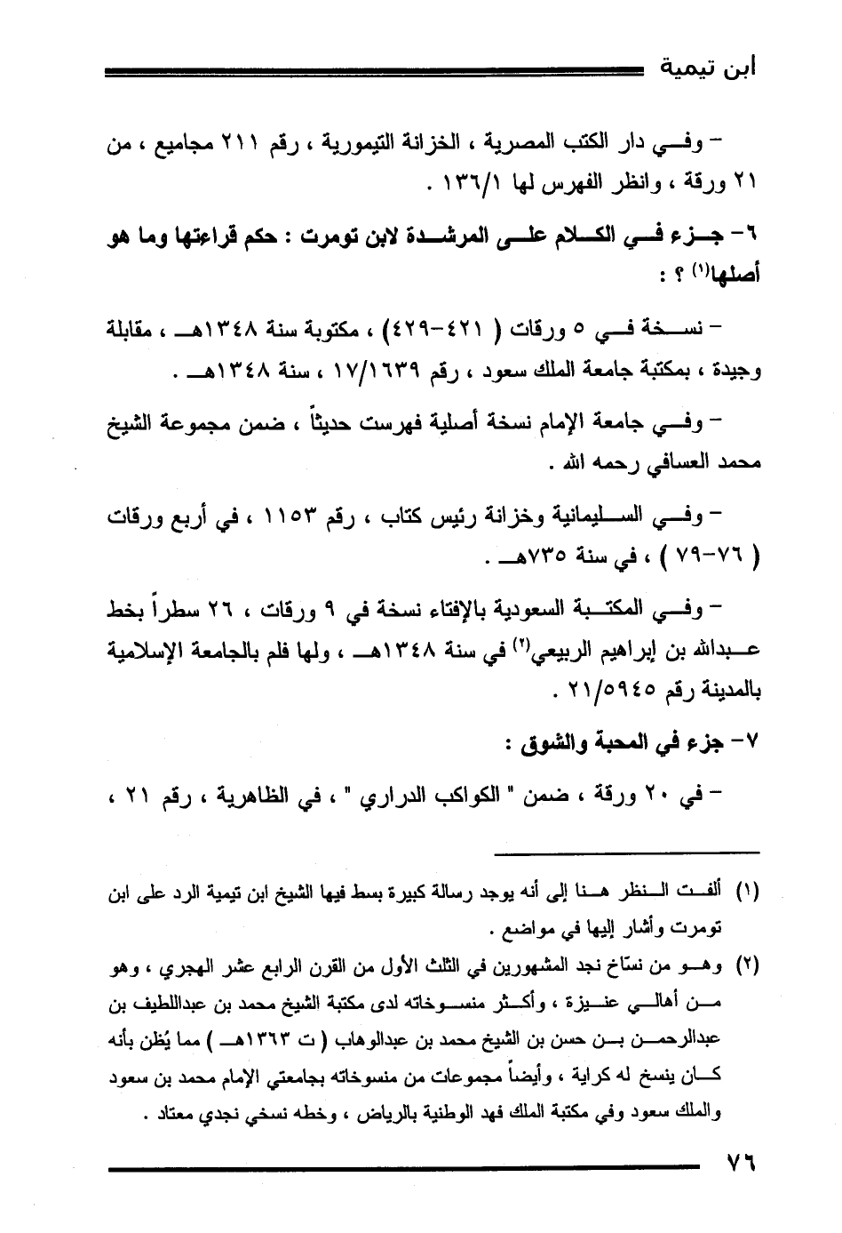 - وفي المكتبة السعودية بالإفتاء نسخة في 9 ورقات، 26 سطراً بخط عبد الله بن إبراهيم الربيعي (2) في سنة 1348هـ، ولها فلم بالجامعة الإسلامية بالمدينة رقم 5945/21.