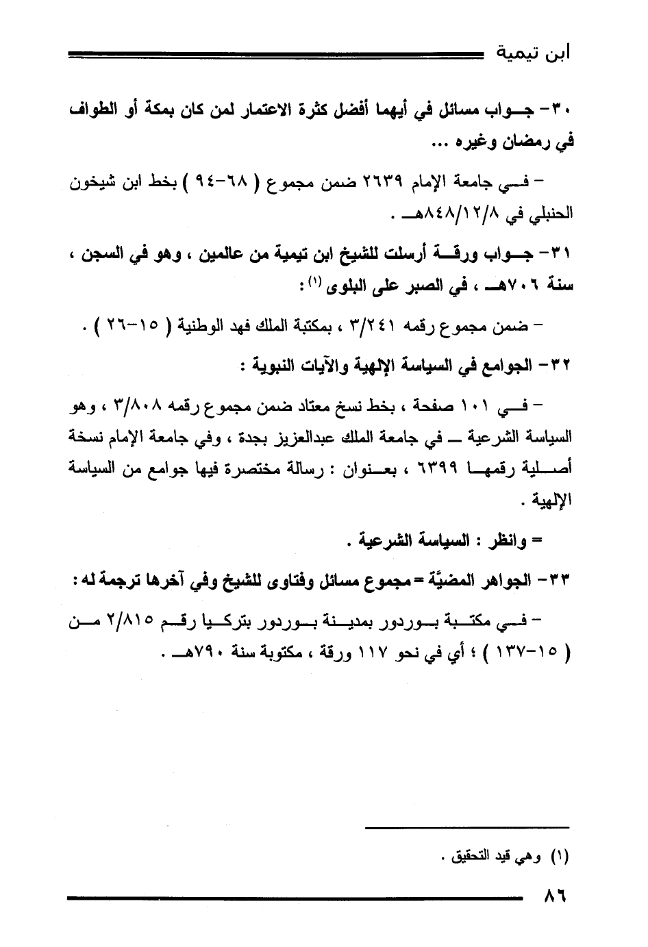 31- جواب ورقة أرسلت للشيخ ابن تيمية من عالمين، وهو في السجن، سنة 706هـ، في الصبر على البلوى (1) :