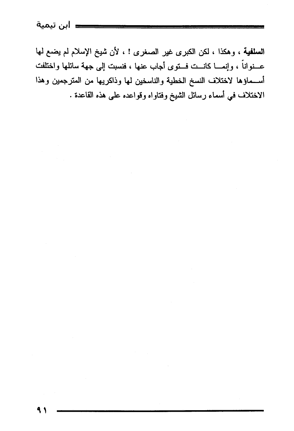 السلفية، وهكذا، لكن الكبرى غير الصغرى! ، لأن شيخ الإسلام لم يضع لها عنواناً، وإنما كانت فتوى أجاب عنها، فنسبت إلى جهة سائلها واختلفت أسماؤها لاختلاف النسخ الخطية والناسخين لها وذاكريها من المترجمين وهذا الاختلاف في أسماء رسائل الشيخ وفتاواه وقواعده على هذه القاعدة.