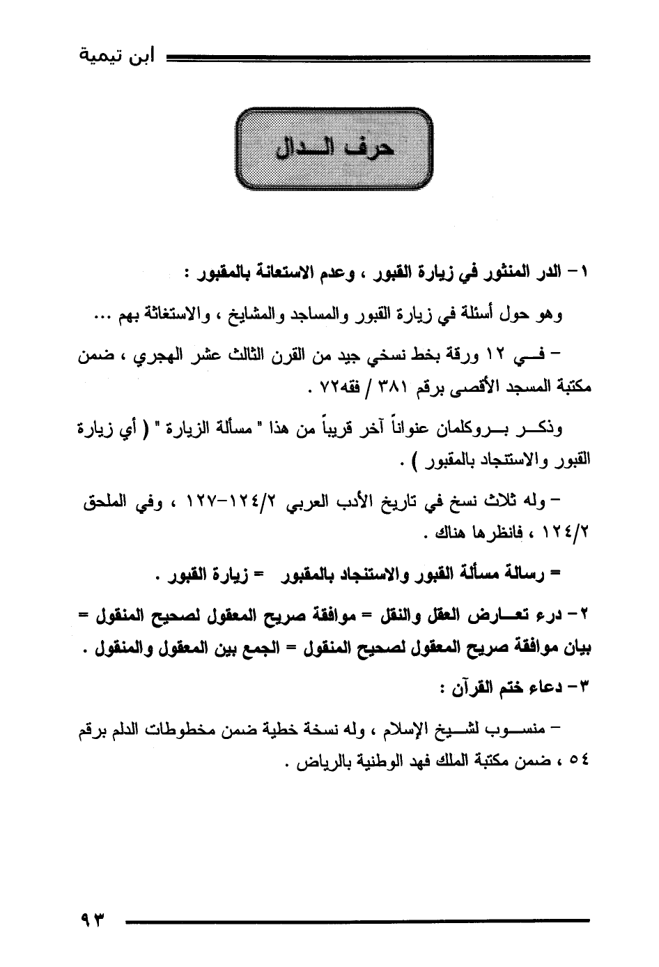 - منسوب لشيخ الإسلام، وله نسخة خطية ضمن مخطوطات الدلم برقم 54، ضمن مكتبة الملك فهد الوطنية بالرياض.