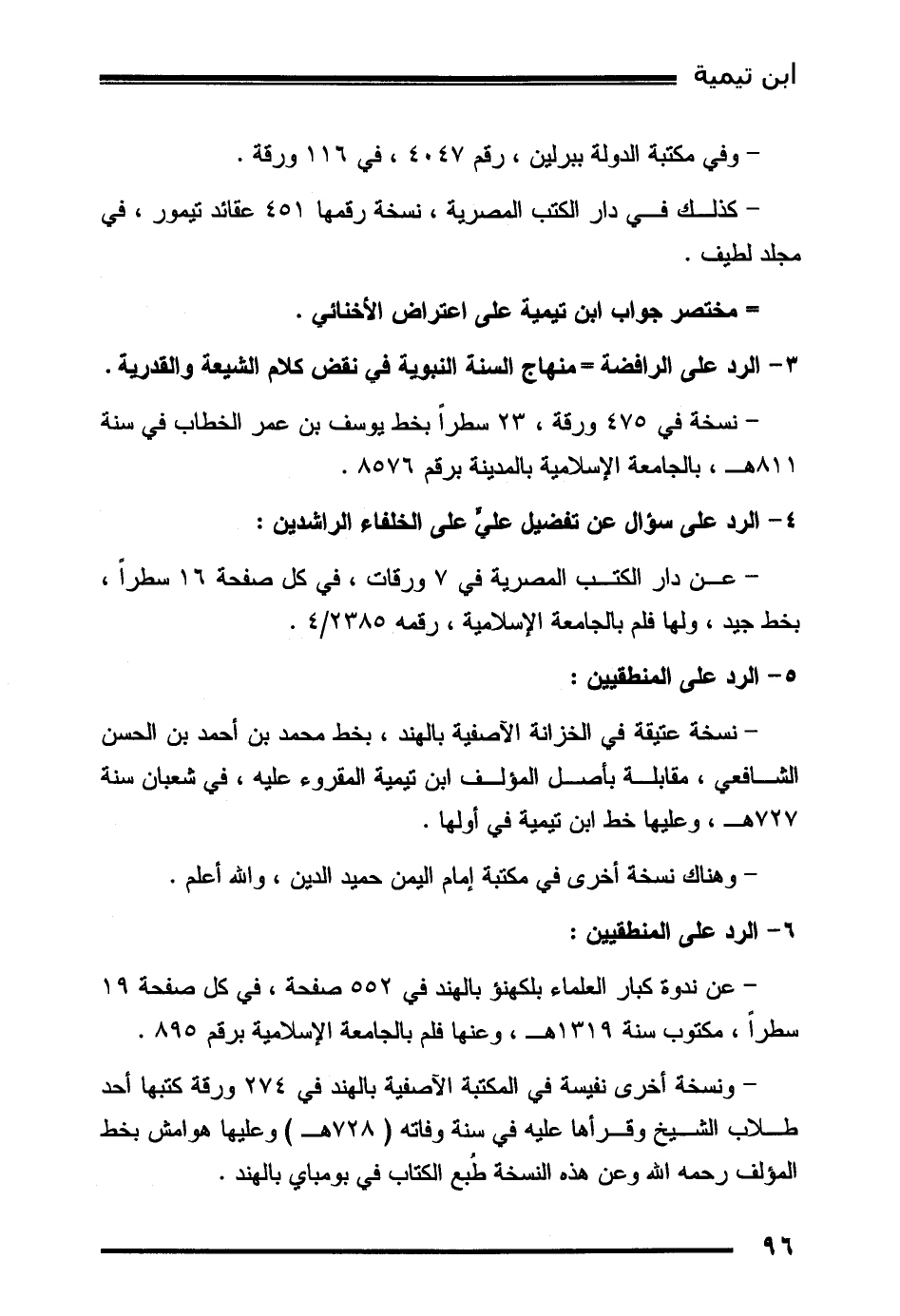- عن ندوة كبار العلماء بلكهنؤ بالهند في 552 صفحة، في كل صفحة 19 سطراً، مكتوب سنة 1319هـ، وعنها فلم بالجامعة الإسلامية برقم 895.