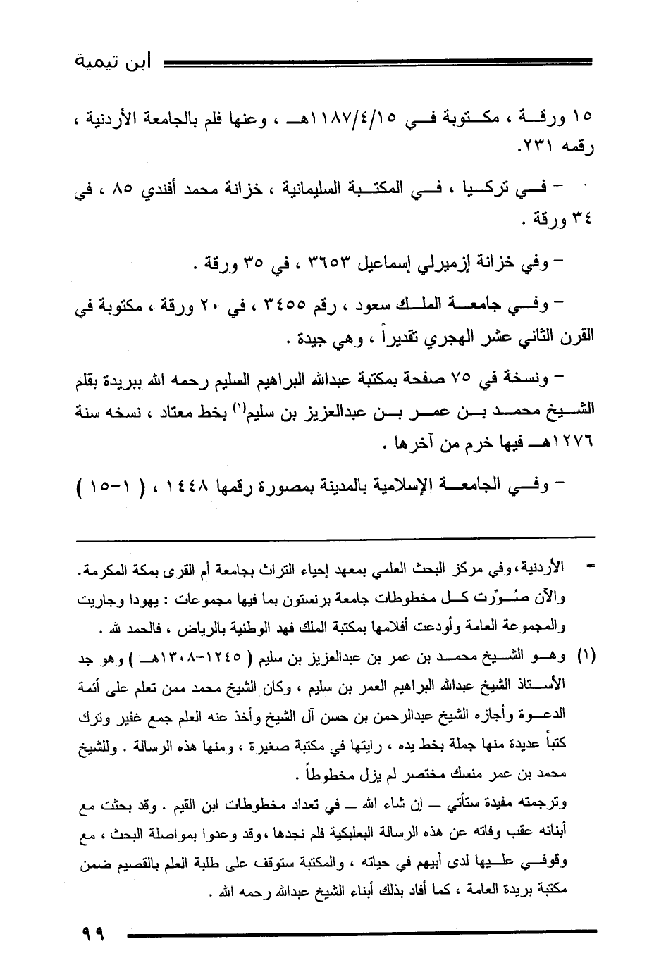 (1) وهو الشيخ محمد بن عمر بن عبد العزيز بن سليم (1245-1308هـ) وهو جد الأستاذ الشيخ عبد الله البراهيم العمر بن سليم، وكان الشيخ محمد ممن تعلم على أئمة الدعوة وأجازه الشيخ عبد الرحمن بن حسن آل الشيخ وأخذ عنه العلم جمع غفير وترك كتباً عديدة منها جملة بخط يده، رايتها في مكتبة صغيرة، ومنها هذه الرسالة. وللشيخ محمد بن عمر منسك مختصر لم يزل مخطوطاً.