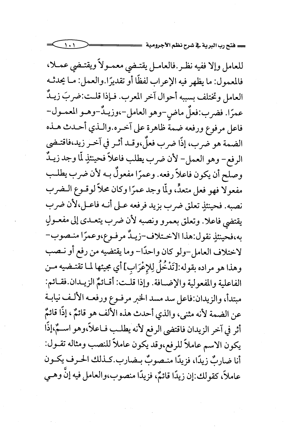 للعامل وإلا فيه نظر. فالعامل يقتضي معمولاً ويقتضي عملا، فالمعمول: ما يظهر فيه الإعراب لفظًا أو تقديرًا. والعمل: ما يحدثه العامل وتختلف بسببه أحوال آخر المعرب. فإذا قلت: ضربَ زيدٌ عمرًا. فضرب: فعلٌ ماضٍ-وهو العامل-،وزيدٌ-وهو المعمول- فاعل مرفوع ورفعه ضمة ظاهرة على آخره. والذي أحدث هذه الضمة هو ضرب، إذًا ضرب فعلٌ، وقد أثر في آخر زيد، فاقتضى الرفع- وهو العمل- لأن ضرب يطلب فاعلاً فحينئذٍ لمّا وجد زيد وصلح أن يكون فاعلاً رفعه. وعمرًا مفعولٌ به لأن ضرب يطلب مفعولا فهو فعل متعدٍّ، ولمّا وجد عمرو وكان محلاً لوقوع الضرب نصبه. فحينئذٍ تعلق ضرب بزيد فرفعه على أنه فاعل، لأن ضرب يقتضي فاعلا. وتعلق بعمرو ونصبه لأن ضرب يتعدى إلى مفعولٍ به، فحينئذٍ نقول: هذا الاختلاف-زيدٌ مرفوع، وعمرًا منصوب- لاختلاف العامل-ولو كان واحدًا- وما يقتضيه من رفع أو نصب وهذا هو مراده بقوله: [تَدْخُلُ لِلإِعْرَابِ] أي مجيئها لما تقتضيه من الفاعلية والمفعولية والإضافة. وإذا قلت: أقائمٌ الزيدان.