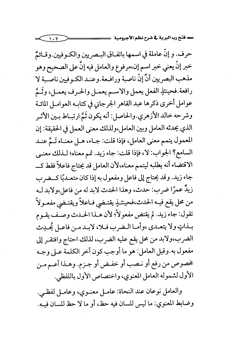 والعامل نوعان عند النحاة: عامل معنوي، وعامل لفظي. وضابط المعنوي: ما ليس للسان فيه حظ، أو ما لا حظ للسان فيه.