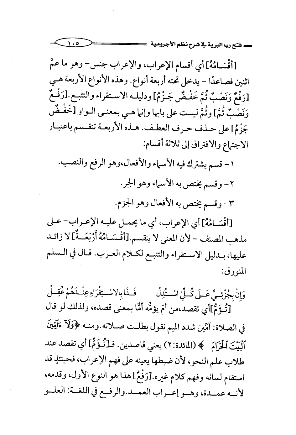 [أقْسَامُهُ] أي أقسام الإعراب، الإعراب جنس- وهو ما عمَّ اثنين فصاعدًا - يدخل تحته أربعة أنواع. وهذه الأنواع الأربعة هي [رَفْعٌ وَنَصْبٌ ثُمَّ خَفْضٌ جَزْمُ] ودليله الاستقراء والتتبع. [رَفْعٌ وَنَصْبٌ ثُمَّ] وثُمَّ ليست على بابها وإنما هي بمعنى الواو [خَفْضٌ جَزْمُ] على حذف حرف العطف. هذه الأربعة تنقسم باعتبار الاجتماع والافتراق إلى ثلاثة أقسام: