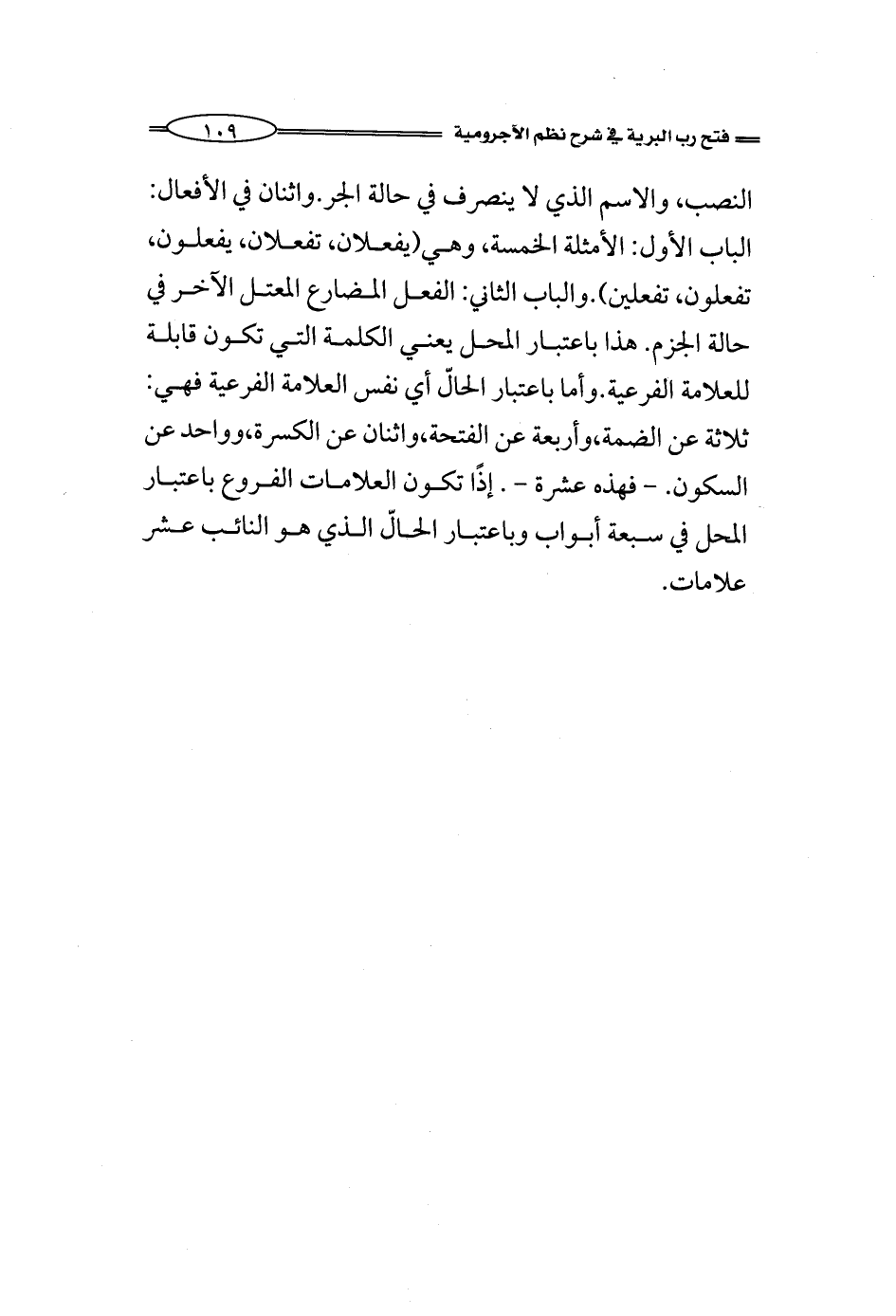 النصب، والاسم الذي لا ينصرف في حالة الجر. واثنان في الأفعال: الباب الأول: الأمثلة الخمسة، وهي (يفعلان، تفعلان، يفعلون، تفعلون، تفعلين).والباب الثاني: الفعل المضارع المعتل الآخر في حالة الجزم. هذا باعتبار المحل يعني الكلمة التي تكون قابلة للعلامة الفرعية. وأما باعتبار الحالّ أي نفس العلامة الفرعية فهي: ثلاثة عن الضمة، وأربعة عن الفتحة، واثنان عن الكسرة، وواحد عن السكون. _فهذه عشرة_. إذًا تكون العلامات الفروع باعتبار المحل في سبعة أبواب وباعتبار الحالّ الذي هو النائب عشر علامات.