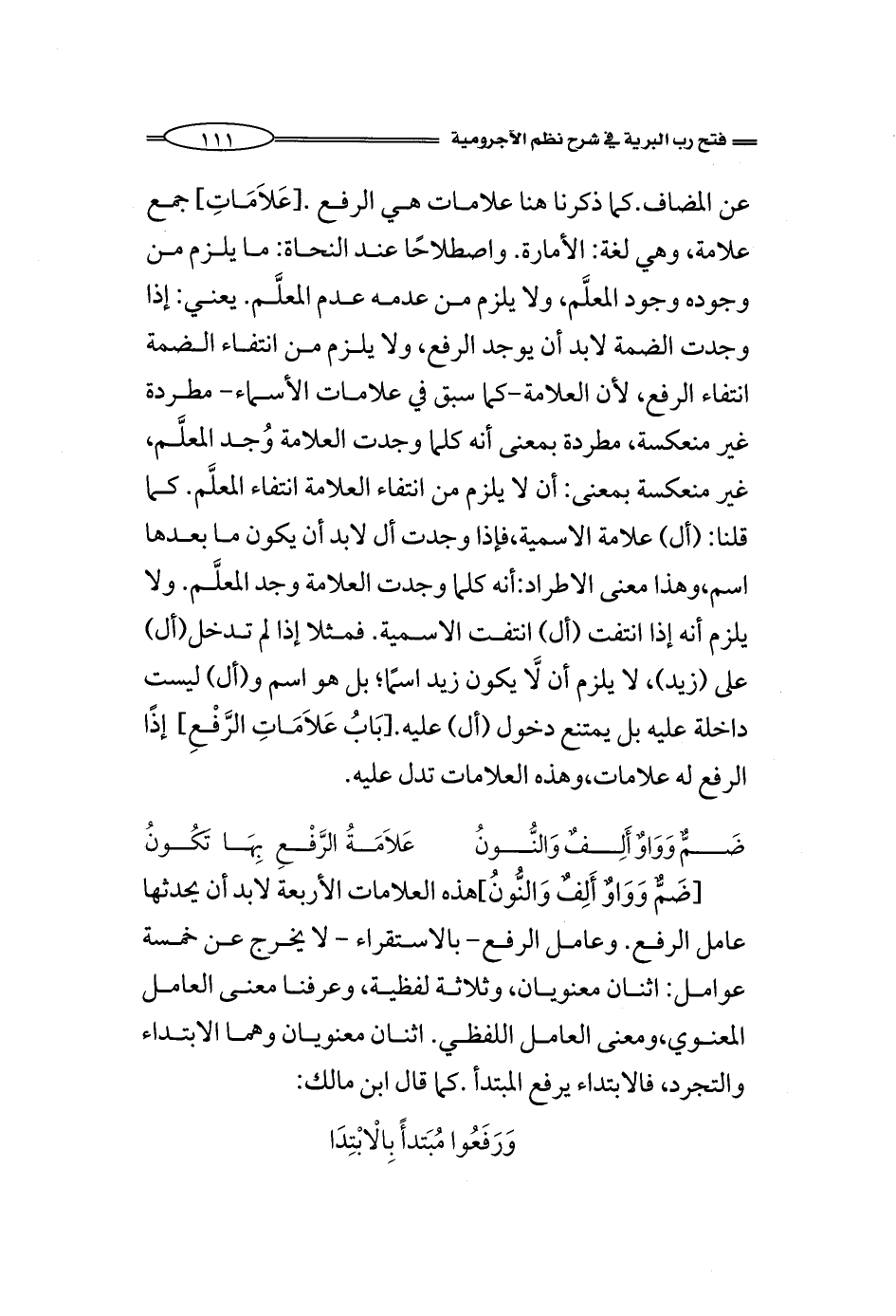 عن المضاف. كما ذكرنا هنا علامات هي الرفع. [عَلاَمَاتِ] جمع علامة، وهي لغة: الأمارة. واصطلاحًا عند النحاة: ما يلزم من وجوده وجود المعلَّم، ولا يلزم من عدمه عدم المعلَّم. يعني: إذا وجدت الضمة لابد أن يوجد الرفع، ولا يلزم من انتفاء الضمة انتفاء الرفع، لأن العلامة-كما سبق في علامات الأسماء- مطردة غير منعكسة، مطردة بمعنى أنه كلما وجدت العلامة وُجد المعلَّم، غير منعكسة بمعنى: أن لا يلزم من انتفاء العلامة انتفاء المعلَّم. كما قلنا: (أل) علامة الاسمية، فإذا وجدت أل لابد أن يكون ما بعدها اسم، وهذا معنى الاطراد: أنه كلما وجدت العلامة وجد المعلَّم. ولا يلزم أنه إذا انتفت (أل) انتفت الاسمية. فمثلا إذا لم تدخل (أل) على (زيد) لا يلزم أن لا يكون زيد اسمًا؛ بل هو اسم و (أل) ليست داخلة عليه بل يمتنع دخول (أل) عليه. [بَابُ عَلاَمَاتِ الرَّفْعِ] إذًا الرفع له علامات، وهذه العلامات تدل عليه.