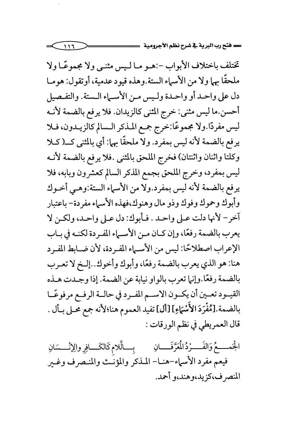 تختلف باختلاف الأبواب -:هو ما ليس مثنى ولا مجموعًا ولا ملحقًا بهما ولا من الأسماء الستة. وهذه قيود عدمية، أوتقول: هوما دل على واحد أو واحدة وليس من الأسماء الستة. والتفصيل أحسن. ما ليس مثنى: خرج المثنى كالزيدان. فلا يرفع بالضمة لأنه ليس مفردًا. ولا مجموعًا: خرج جمع المذكر السالم كالزيدون، فلا يرفع بالضمة لأنه ليس بمفرد. ولا ملحقًا بهما: أي بالمثنى كـ (كلا وكلتا واثنان واثنتان) فخرج الملحق بالمثنى. فلا يرفع بالضمة لأنه ليس بمفرد، وخرج الملحق بجمع المذكر السالم كعشرون وبابه، فلا يرفع بالضمة لأنه ليس بمفرد. ولا من الأسماء الستة: وهي أخوك وأبوك وحموك وفوك وذو مال وهنوك، فهذه الأسماء مفردة- باعتبار آخر- لأنها دلت على واحد. فأبوك: دل على واحد، ولكن لا يعرب بالضمة رفعًا، وإن كان من الأسماء المفردة لكنه في باب الإعراب اصطلاحًا: ليس من الأسماء المفردة، لأن ضابط المفرد هنا: هو الذي يعرب بالضمة رفعًا، وأبوك وأخوك .. إلخ لا تعرب بالضمة رفعًا. وإنما تعرب بالواو نيابة عن الضمة. إذا وجدت هذه القيود تعين أن يكون الاسم المفرد في حالة الرفع مرفوعًا بالضمة. [مُفْرَدَ الأَسْمَاءِ] [أل] تفيد العموم هنا؛ لأنه جمع محلى بأل. قال العمريطي في نظم الورقات: