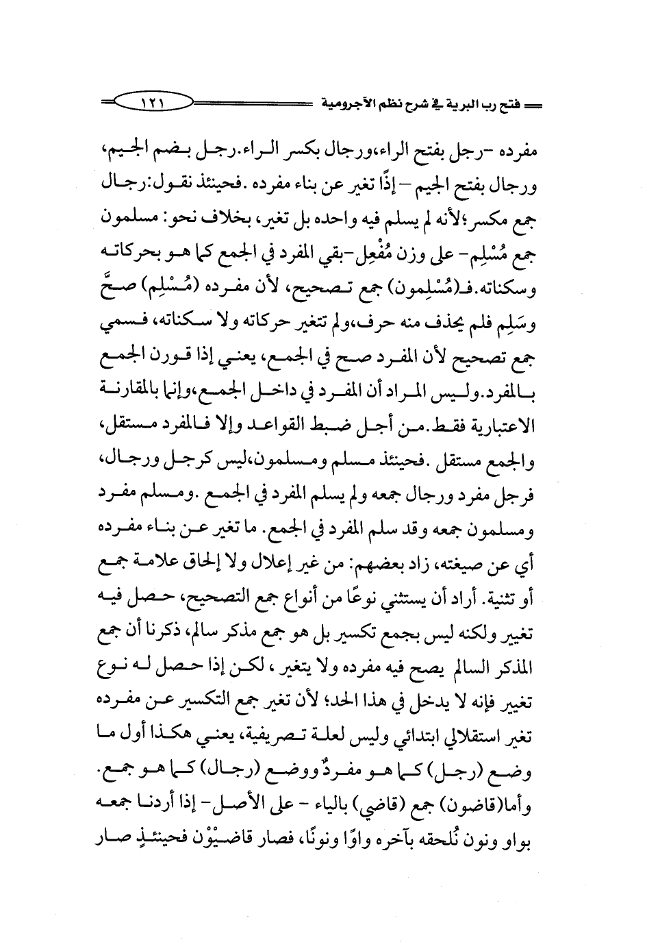 مفرده -رجل بفتح الراء، ورجال بكسر الراء. رجل بضم الجيم، ورجال بفتح الجيم - إذًا تغير عن بناء مفرده. فحينئذ نقول: رجال جمع مكسر؛ لأنه لم يسلم فيه واحده بل تغير، بخلاف نحو: مسلمون جمع مُسْلِم- على وزن مُفْعِل-بقي المفرد في الجمع كما هو بحركاته وسكناته. فـ (مُسْلِمون) جمع تصحيح، لأن مفرده (مُسْلِم) صحَّ وسَلِم فلم يحذف منه حرف، ولم تتغير حركاته ولا سكناته، فسمي جمع تصحيح لأن المفرد صح في الجمع، يعني إذا قورن الجمع بالمفرد. وليس المراد أن المفرد في داخل الجمع، وإنما بالمقارنة الاعتبارية فقط. من أجل ضبط القواعد وإلا فالمفرد مستقل، والجمع مستقل. فحينئذ مسلم ومسلمون، ليس كرجل ورجال، فرجل مفرد ورجال جمعه ولم يسلم المفرد في الجمع. ومسلم مفرد ومسلمون جمعه وقد سلم المفرد في الجمع. ما تغير عن بناء مفرده أي عن صيغته، زاد بعضهم: من غير إعلال ولا إلحاق علامة جمع أو تثنية. أراد أن يستثني نوعًا من أنواع جمع التصحيح، حصل فيه تغيير ولكنه ليس بجمع تكسير بل هو جمع مذكر سالم، ذكرنا أن جمع المذكر السالم يصح فيه مفرده ولا يتغير، لكن إذا حصل له نوع تغيير فإنه لا يدخل في هذا الحد؛ لأن تغير جمع التكسير عن مفرده تغير استقلالي ابتدائي وليس لعلة تصريفية، يعني هكذا أول ما وضع (رجل) كما هو مفردٌ ووضع (رجال) كما هو جمع. وأما (قاضون) جمع (قاضي) بالياء - على الأصل- إذا أردنا جمعه بواو ونون نُلحقه بآخره واوًا ونونًا، فصار قاضيْوْن فحينئذٍ صار