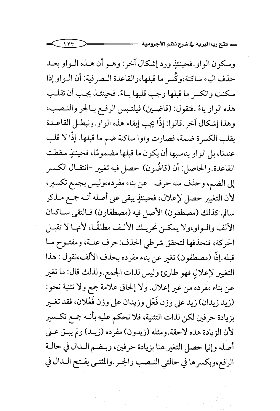 وسكون الواو. فحينئذٍ ورد إشكال آخر: وهو أن هذه الواو بعد حذف الياء ساكنة، وكُسر ما قبلها، والقاعدة الصرفية: أن الواو إذا سكنت وانكسر ما قبلها وجب قلبها ياءًا. فحينئذ يجب أن تقلب هذه الواو ياءًا. فتقول: (قاضين) فيلتبس الرفع بالجر والنصب، وهذا إشكال آخر. قالوا: إذًا يجب إبقاء هذه الواو. ونبطل القاعدة بقلب الكسرة ضمة، فصارت واوا ساكنة ضم ما قبلها. إذًا لا قلب عندنا، بل الواو يناسبها أن يكون ما قبلها مضمومًا، حينئذٍ سقطت القاعدة. والحاصل: أن (قاضُون) حصل فيه تغيير -انتقال الكسر إلى الضم، وحذف منه حرف- عن بناء مفرده، وليس بجمع تكسير، لأن التغيير حصل لإعلال، فحينئذٍ يبقى على أصله أنه جمع مذكر سالم. كذلك (مصطفون) الأصل فيه (مصطفاون) فالتقى ساكنان الألف والواو، ولا يمكن تحريك الألف مطلقًا، لأنها لا تقبل الحركة، فنحذفها لتحقق شرطي الحذف: حرف علة، ومفتوح ما قبله. إذًا (مصطفون) تغير عن بناء مفرده بحذف الألف، نقول: هذا التغيير لإعلالٍ فهو طارئ وليس لذات الجمع. ولذلك قال: ما تغير عن بناء مفرده من غير إعلال. ولا إلحاق علامة جمع ولا تثنية نحو: (زيد زيدان) زيد على وزن فَعْل وزيدان على وزن فَعْلان، فقد تغير بزيادة حرفين لكن لذات التثنية، فلا نحكم عليه بأنه جمع تكسير لأن الزيادة هذه لاحقة. ومثله (زيدون) مفرده (زيد) ولم يبق على أصله وإنما حصل التغير هنا بزيادة حرفين، وبضم الدال في حالة الرفع، وبكسرها في حالتي النصب والجر. والمثنى بفتح الدال في