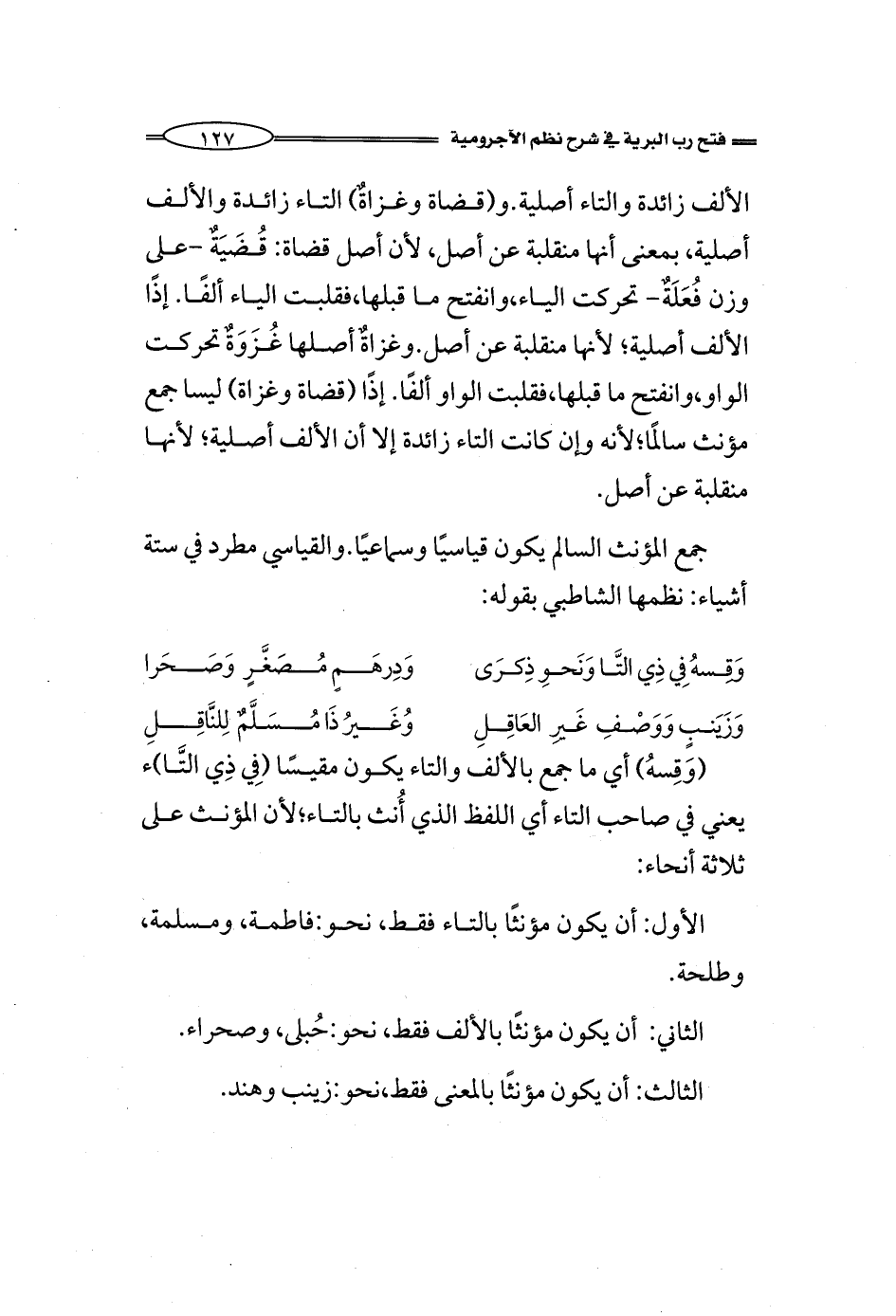 الألف زائدة والتاء أصلية. و (قضاة وغزاةٌ) التاء زائدة والألف أصلية، بمعنى أنها منقلبة عن أصل، لأن أصل قضاة: قُضَيَةٌ -على وزن فُعَلَةٌ- تحركت الياء، وانفتح ما قبلها، فقلبت الياء ألفًا. إذًا الألف أصلية؛ لأنها منقلبة عن أصل. وغزاةٌ أصلها غُزَوَةٌ تحركت الواو، وانفتح ما قبلها، فقلبت الواو ألفًا. إذًا (قضاة وغزاة) ليسا جمع مؤنث سالمًا؛ لأنه وإن كانت التاء زائدة إلا أن الألف أصلية؛ لأنها منقلبة عن أصل.