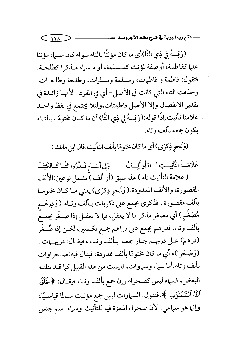(علامة التأنيث تاء) هذا سبق (أو ألف) يشمل نوعين: الألف المقصورة، والألف الممدودة. (وَنَحوِ ذِكرَى) يعني ما كان مختوما بألف مقصورة. فذكرى يجمع على ذكريات بألف وتاء. (وَدِرهَمٍ مُصَغَّرٍ) أي مصغر مذكر ما لا يعقل، فما لا يعقل إذا صغّر يجمع بألف وتاء. فدرهم يجمع على دراهم جمع تكسير، لكن إذا صُغّر (درهم) على دريهم جاز جمعه بألف وتاء، فيقال: دريهمات. (وَصَحَرا) ء أي ما كان مختومًا بألف ممدودة، فيقال فيه: صحراوات بألف وتاء. أما سماء وسماوات، فليست من هذا القبيل كما قد يظنه البعض، فسماء ليس كصحراء وإن جمع بألف وتاء فيقال: (خَلَقَ اللَّهُ السَّمَاوَاتِ).فنقول: السماوات ليس جمع مؤنث سالما قياسيًا، وإنما هو سماعي. لأن صحراء الهمزة فيه للتأنيث. وسماء: اسم جنس